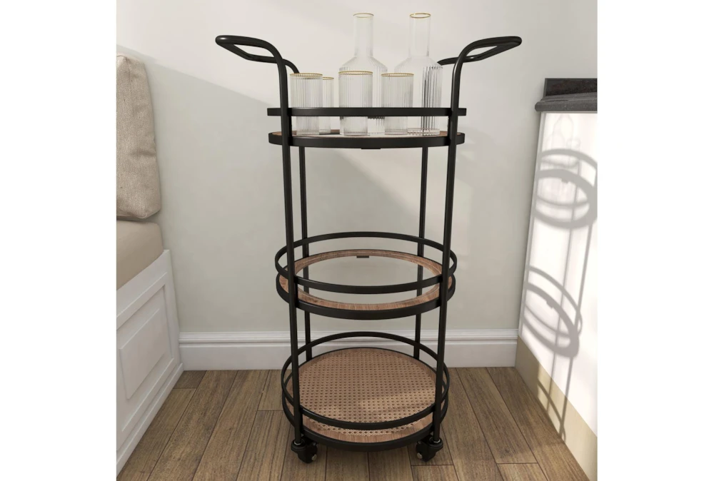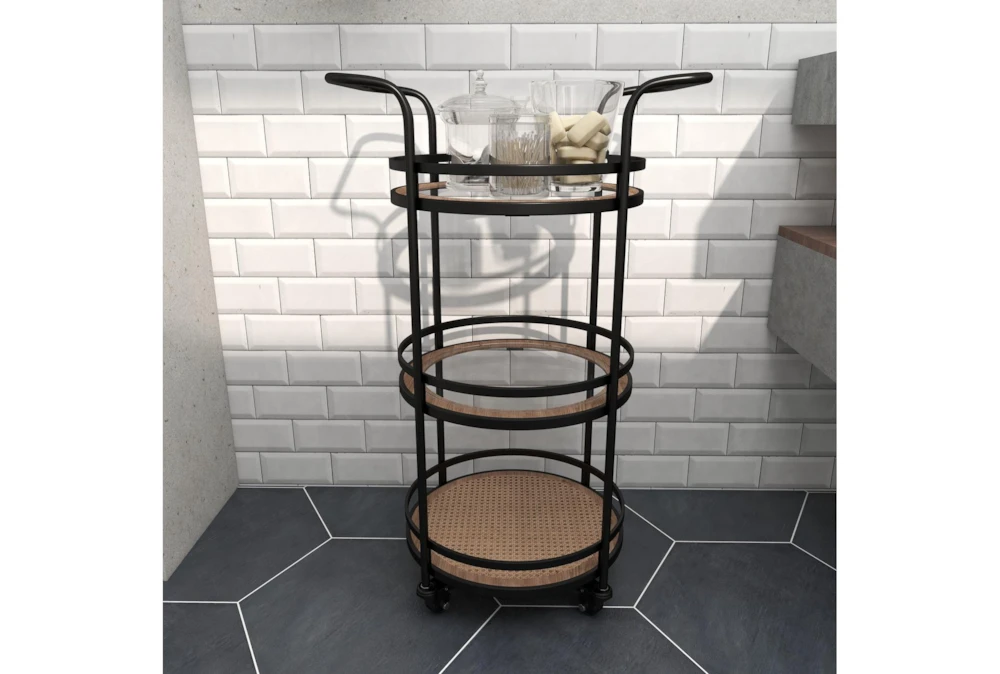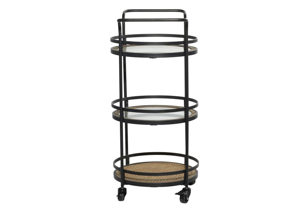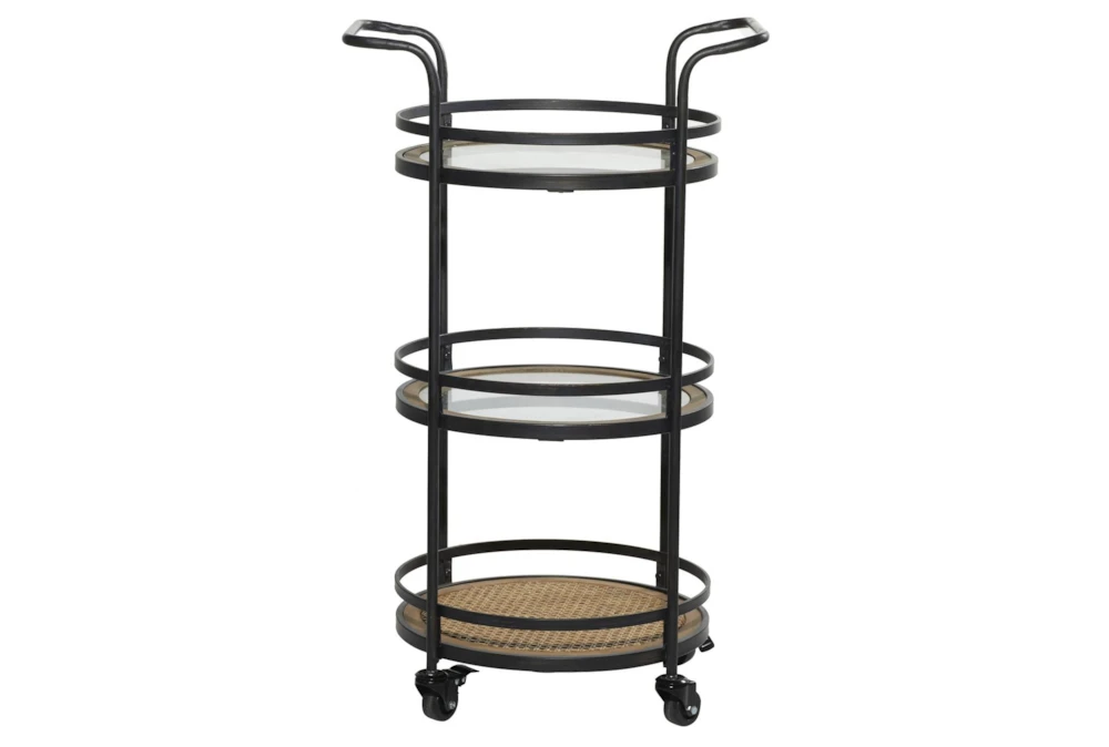 - 3 tiers of round trays with slender design at their respective bases stand on 4 wheels and a metal frame with 2 bar handles