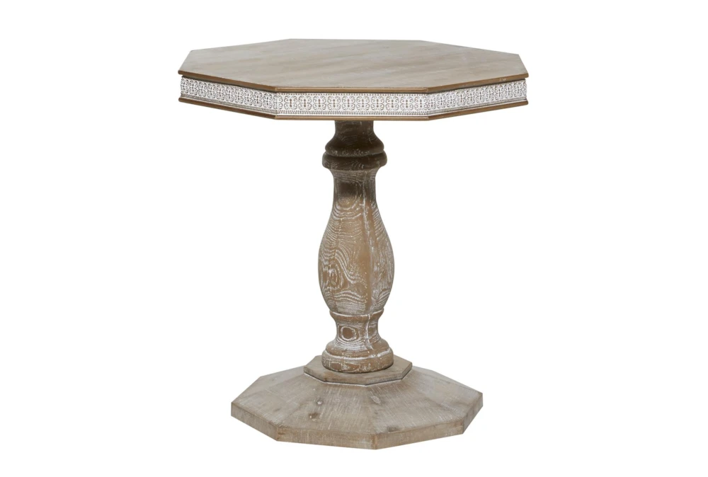 Add a touch of classic style and warmth to your farmhouse-inspired home with this 28X30 Brown Wood Accent Table. Its traditional curved design and elaborate ornate carvings make it a perfect addition to your living room or bedroom. The tall round table is made of solid fir wood materials and features a dark natural brown wood finish with white distressing, an octagon top and base, and a turned style post.