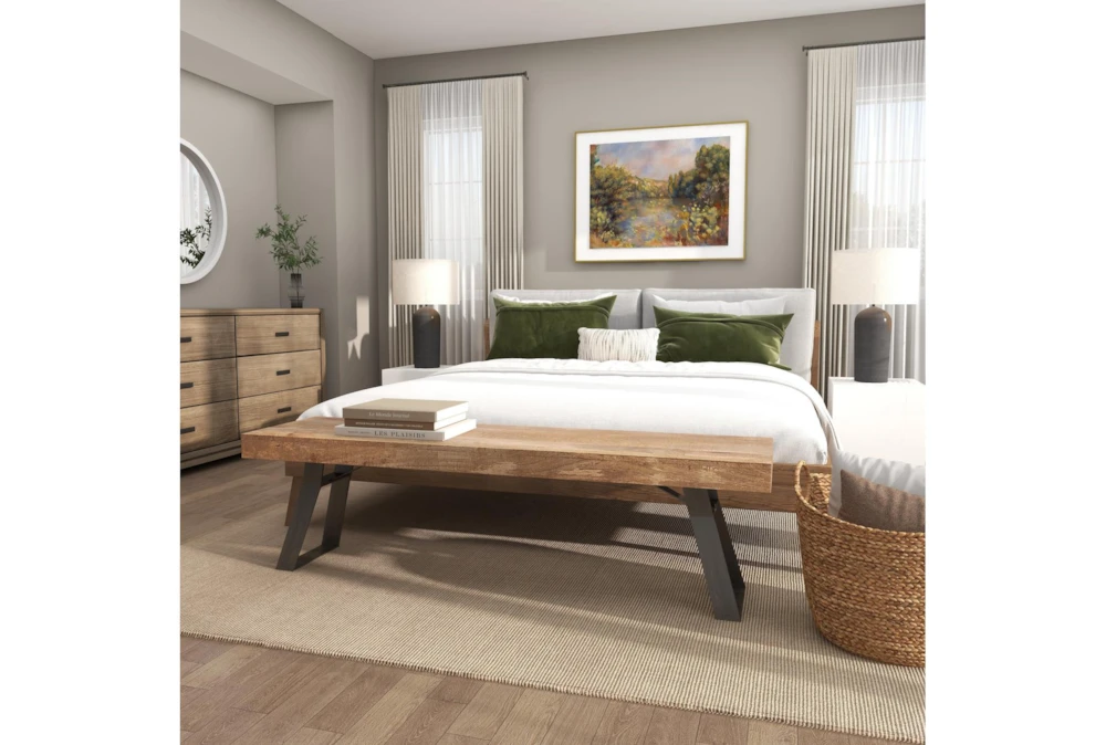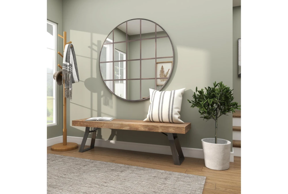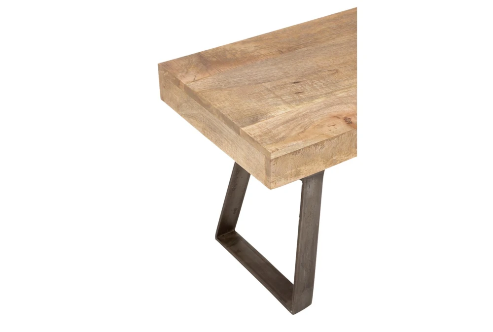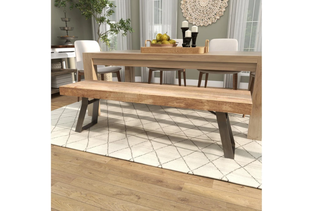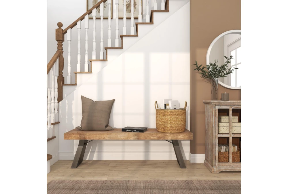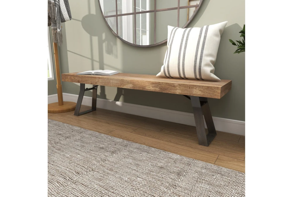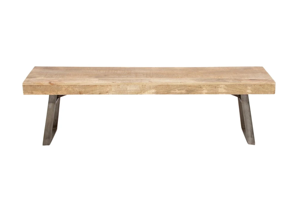 This Industrial Metal And Wood Bench is an assembly-required, light brown dining room bench made from mango wood and iron. Featuring an industrial-inspired design with clean lines and a natural wood grain pattern, this rustic brown bench is a sturdy and simplistic addition to any indoor space.