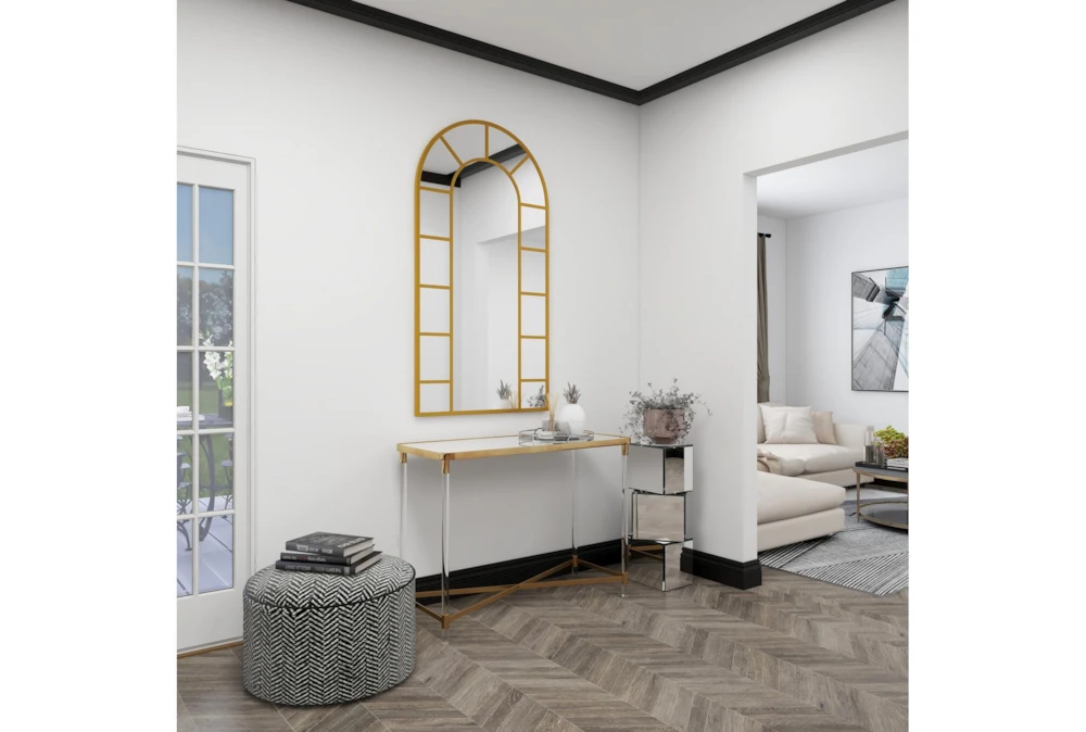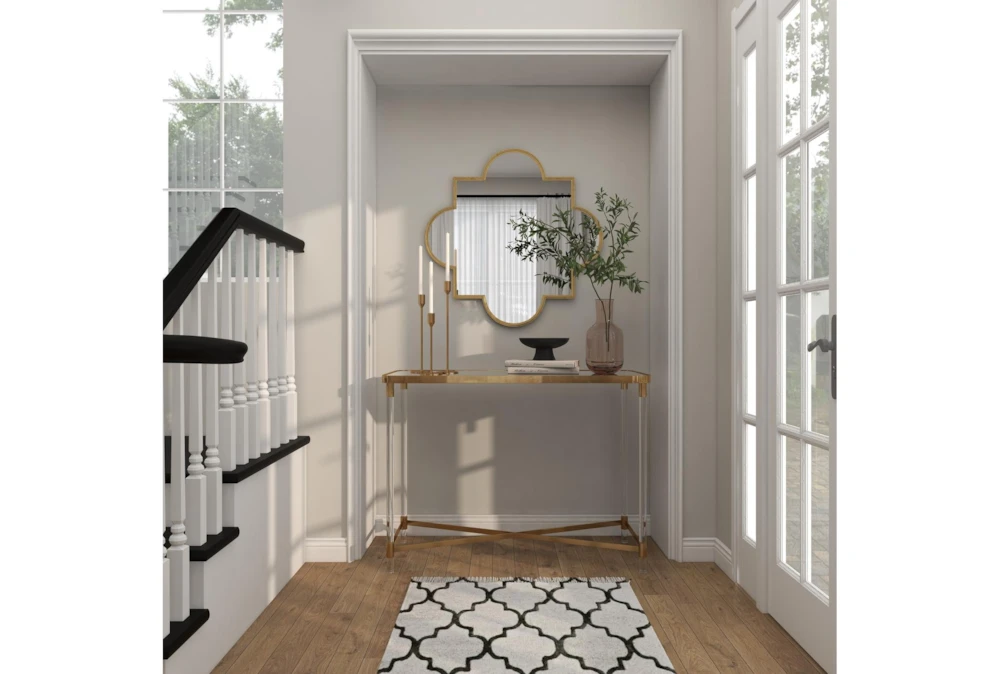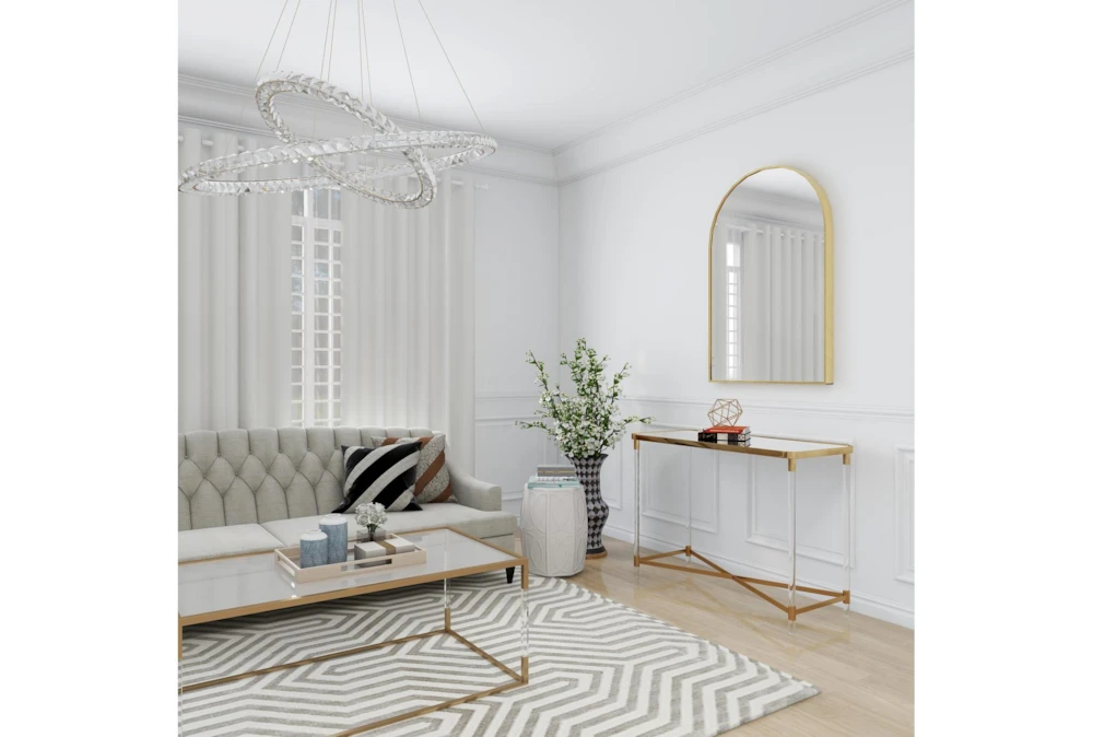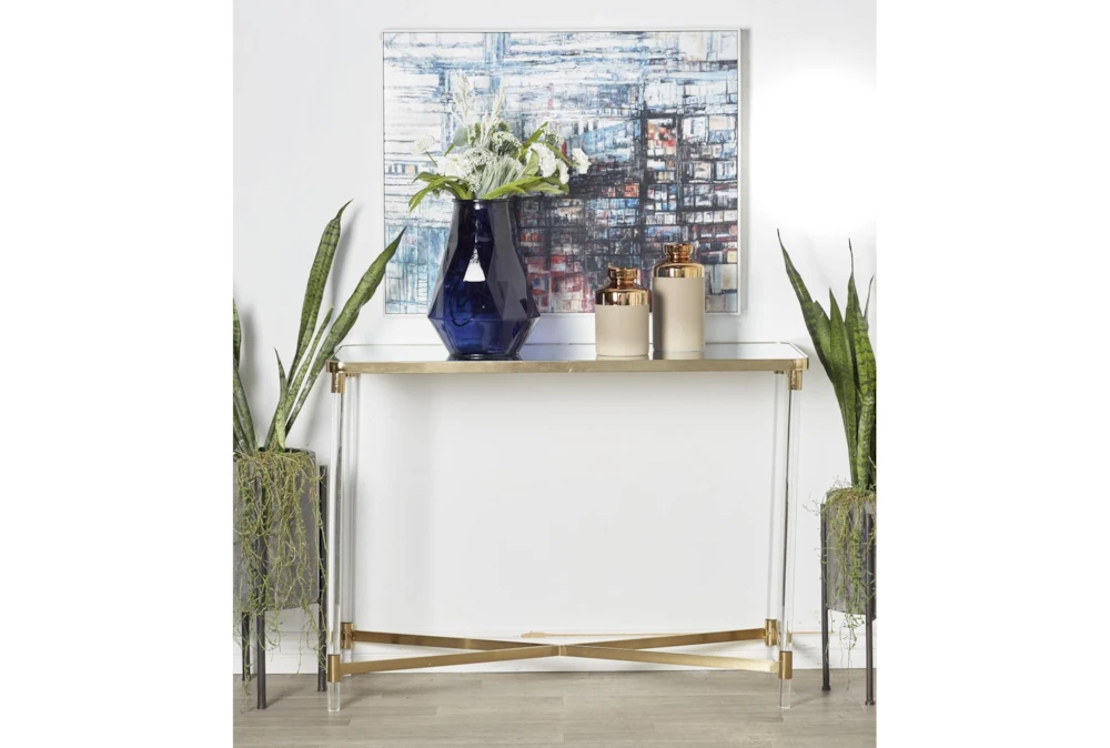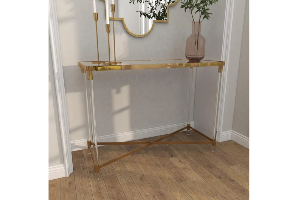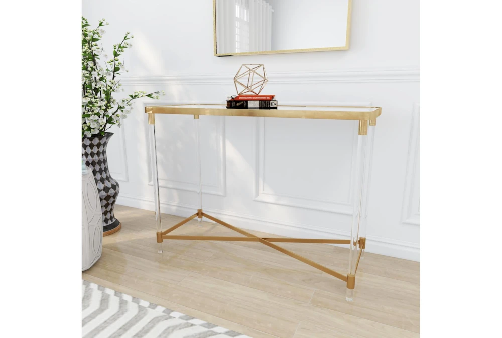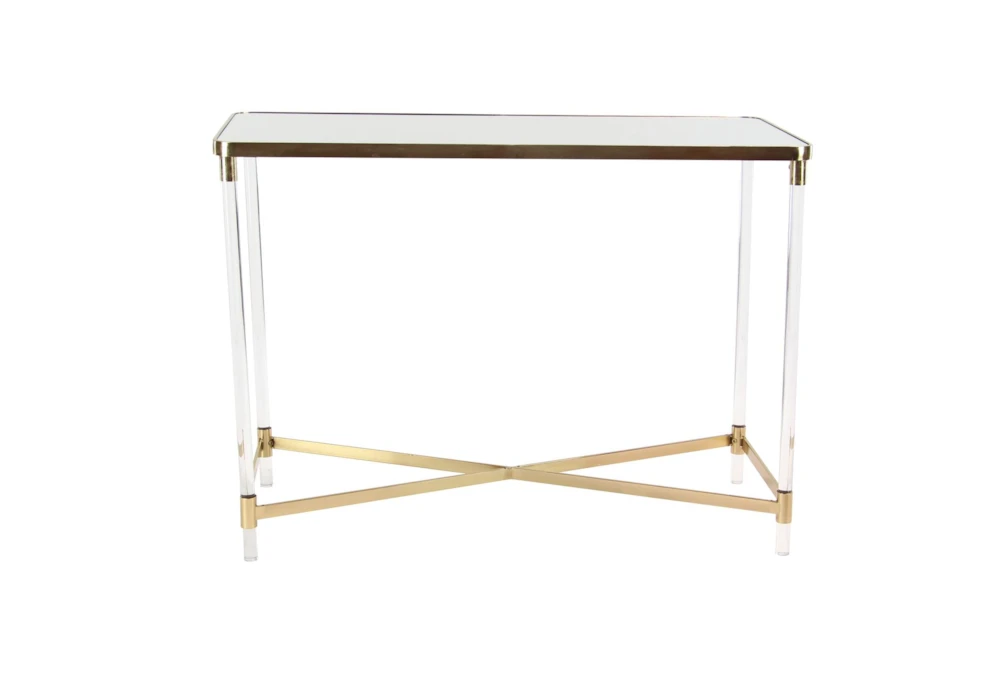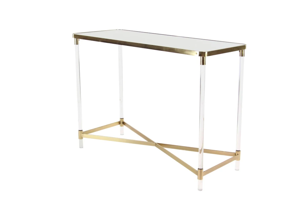 The Acrylic 44″ Console Table is a tall and contemporary piece made of metal, perfect for small living spaces. Its gold color and reflective mirror top with clear acrylic legs give it a bold and simplistic design, while the x base structure provides durability and a spacious mirrored top.