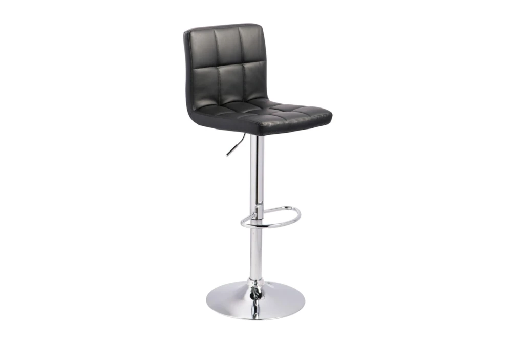 Stool frames made with tubular steel and have weighted pedestal base and adjustable height to move from counter to bar function. Stools have footrest and upholstered seats. D120-130 stool frame has a chrome color finish and a black faux leather upholstered seat with tufted back detail