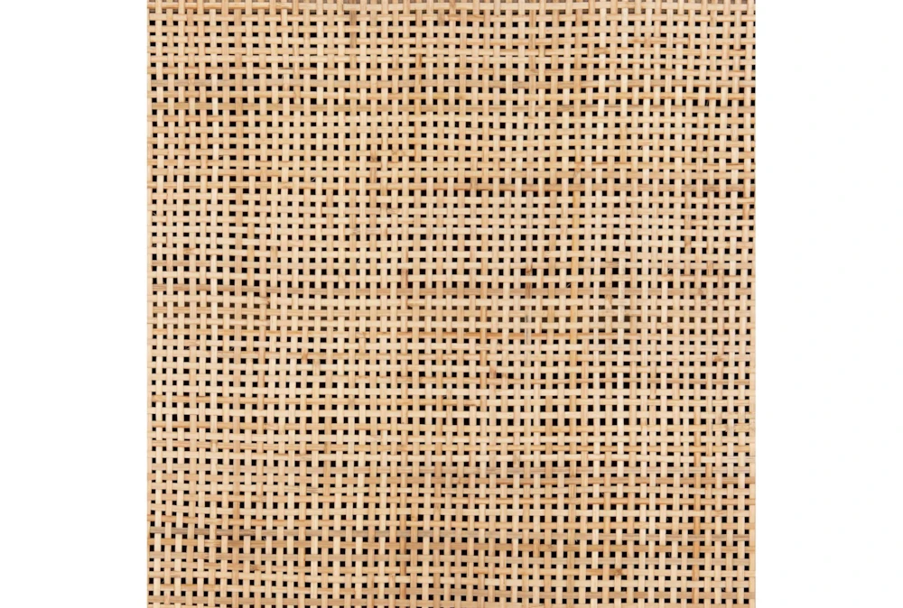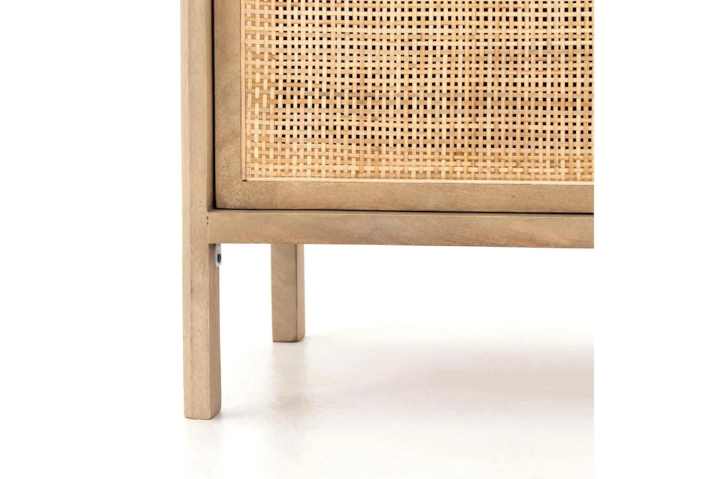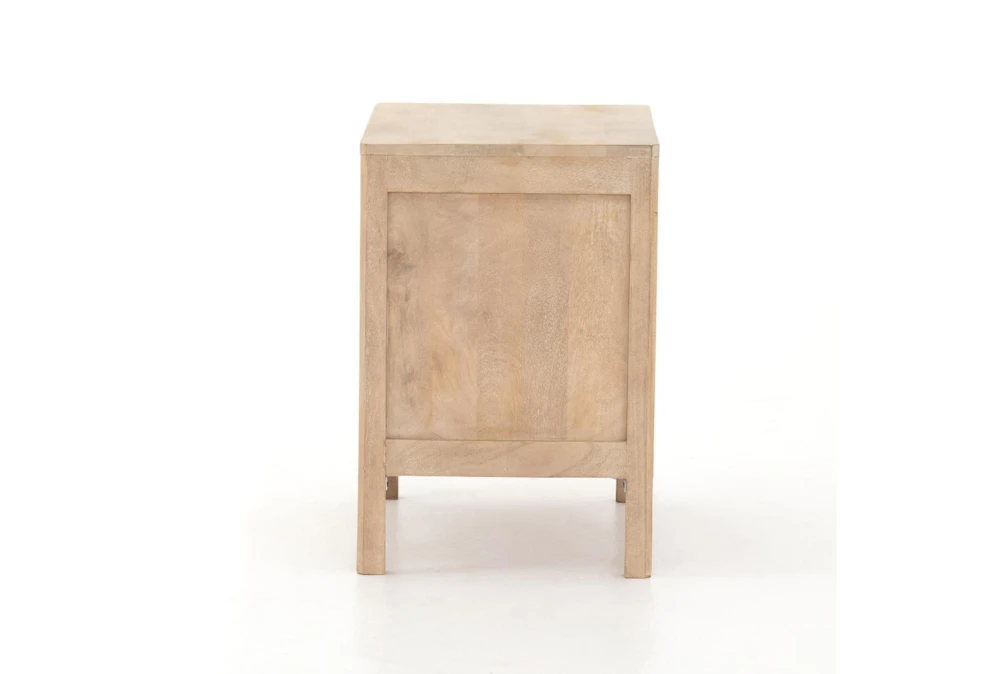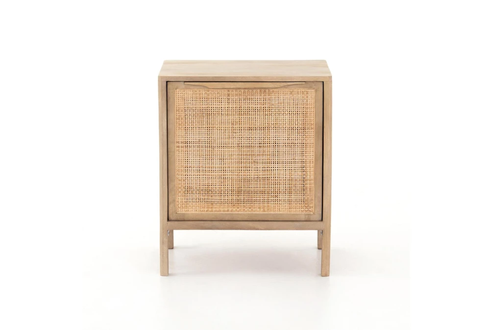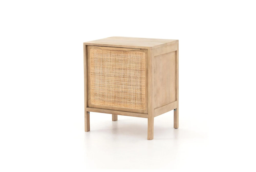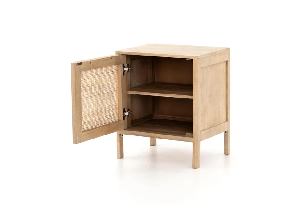 This modern nightstand is made of natural wood and features a left opening design with a cane accent.