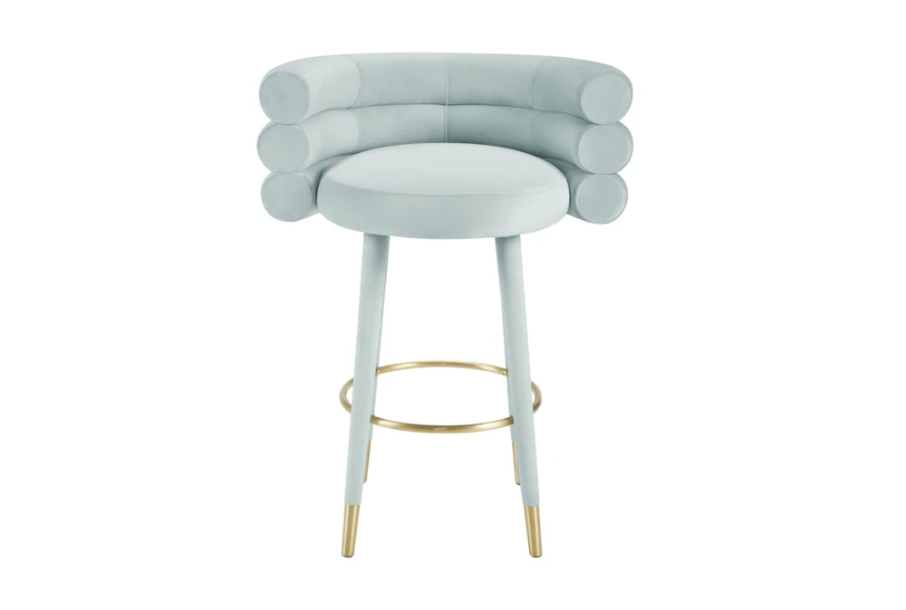 The Brigitte Sea Blue 30 Inch Velvet Barstool is a contemporary piece of furniture made of luxurious fabric and birch wood, perfect for a dining room setting. Assembly is required and the legs are tipped with gold stainless-steel. A fabric swatch is available and the lavish upholstery is offered in two different color choices.