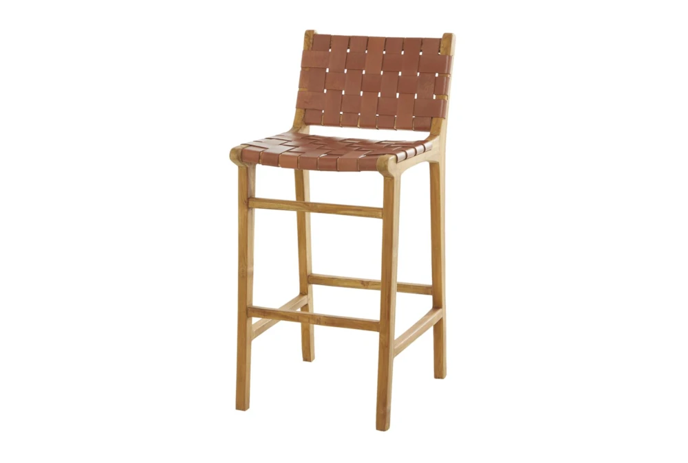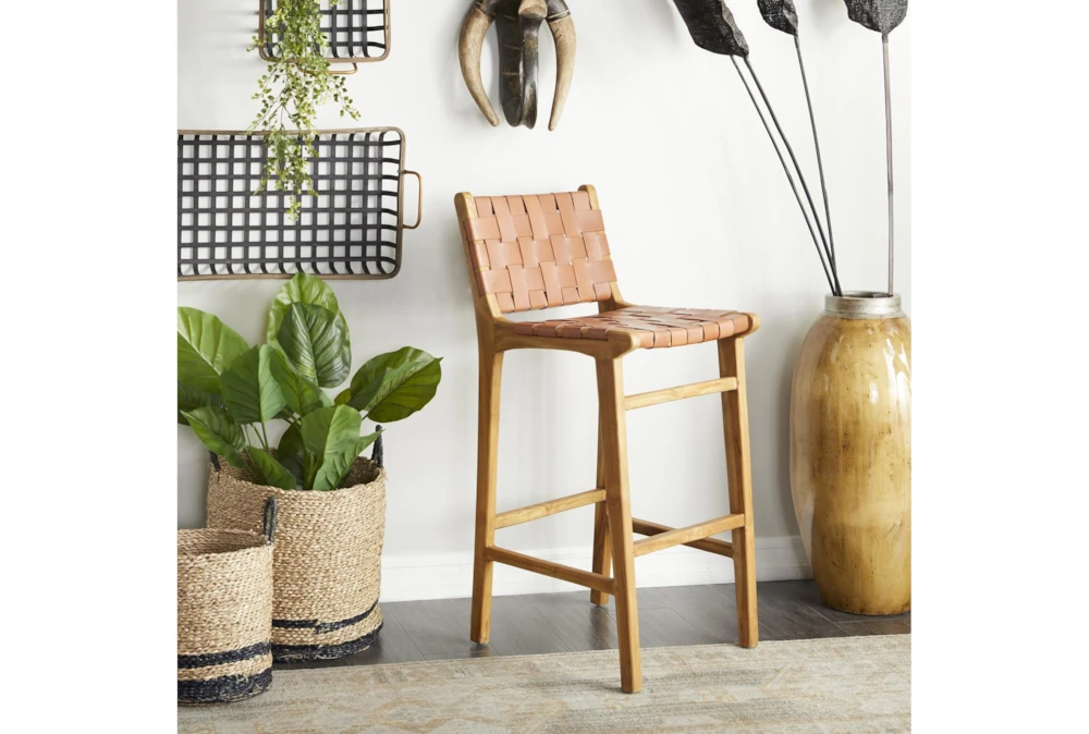 The Brown Woven Leather Bar Stool is a fully assembled modern style stool made of wood and featuring a brown woven leather seat. Its teak color adds warmth to any dining room.