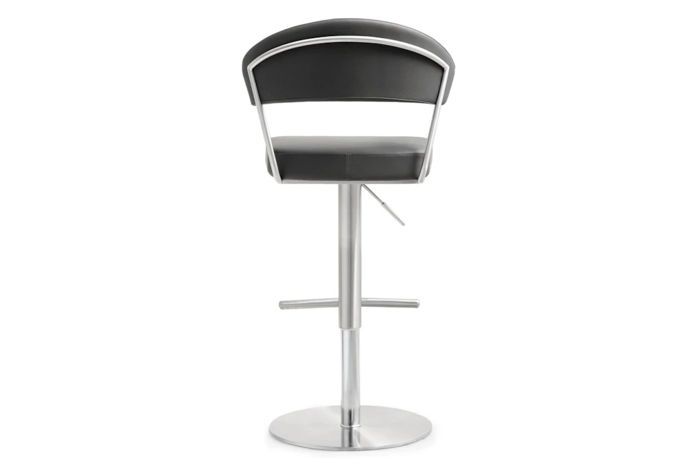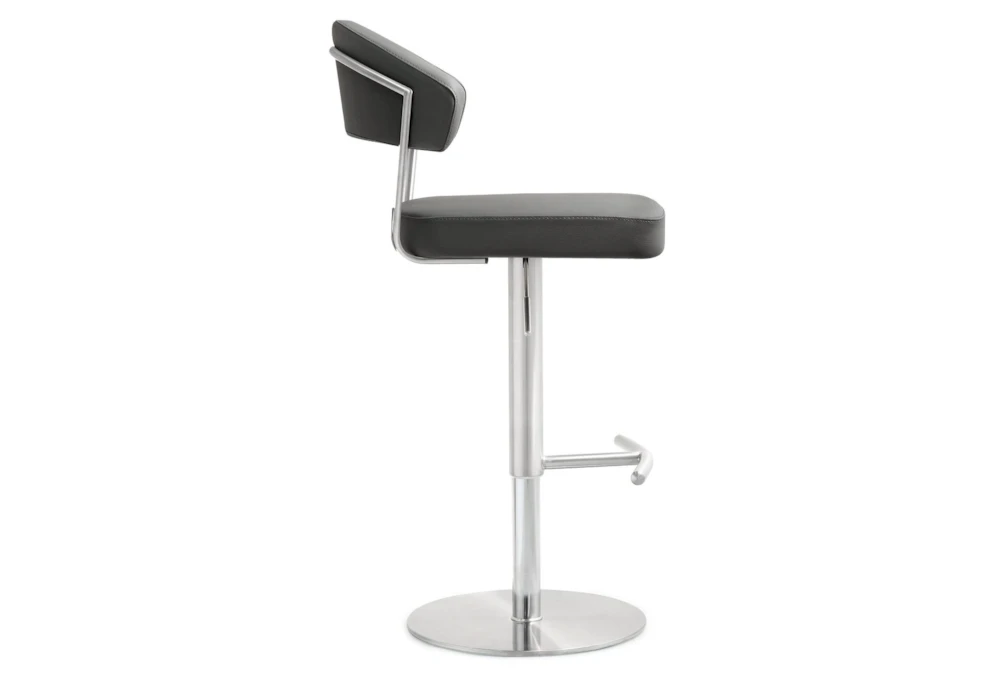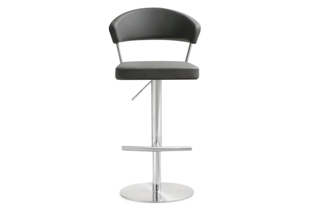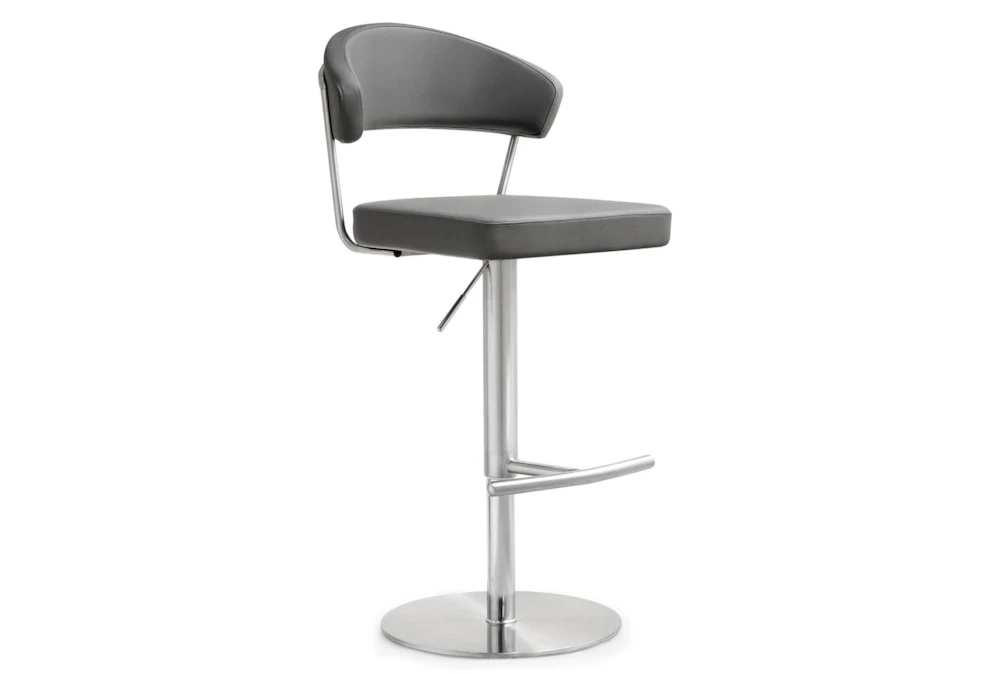 The Cam Grey Stainless Steel Adjustable Barstool features a modern style, swivel function, and is made of fabric and metal. Its grey vegan leather upholstery, stainless steel frame and footrest, adjustable seat height with gas lift, and 360° swivel seat make it a versatile addition to any dining room.