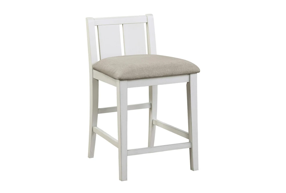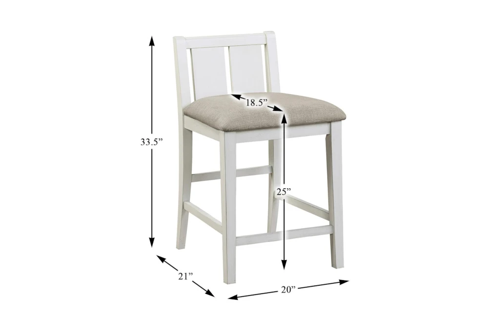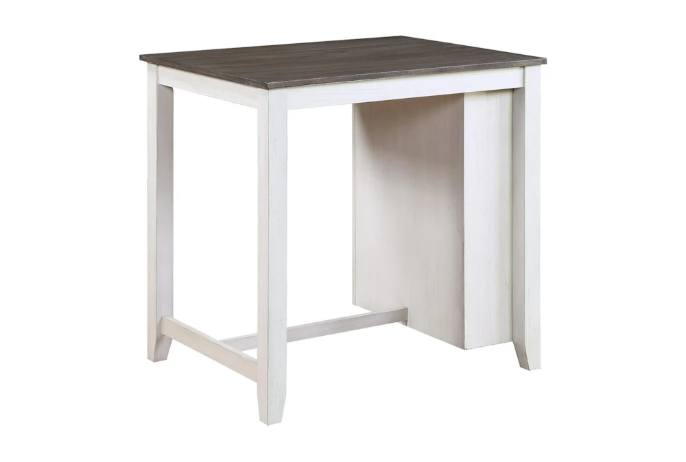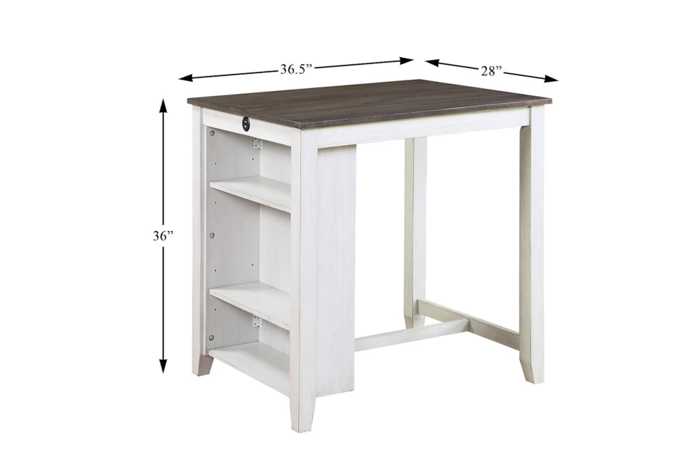 The Damar Grey Counter Set for 2 is a casual, armless dining set made of wood and dolomite with a 2-tone finish of gray and white. It features storage, a tall counter height design, and includes a table with a built-in display shelf and USB charging port, as well as 2 chairs.