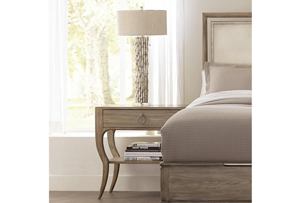 The Esmeralda 29″ 1 Drawer Nightstand is a traditional style piece for your bedroom, made of hardwood solids with oak veneers and Asian hardwood in a grey finish. This tall nightstand has one drawer and shelves for added storage.