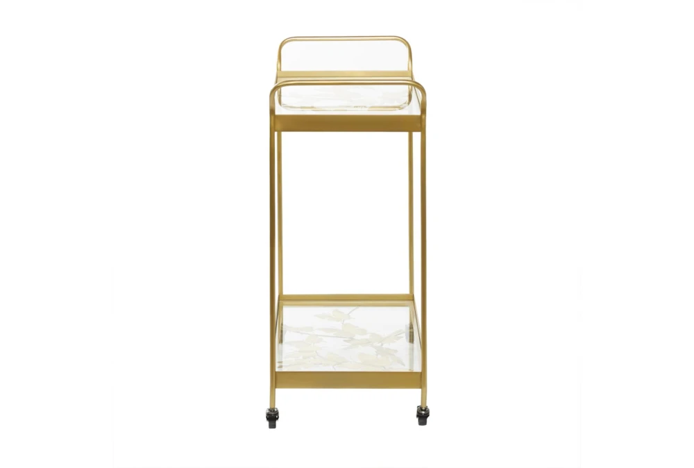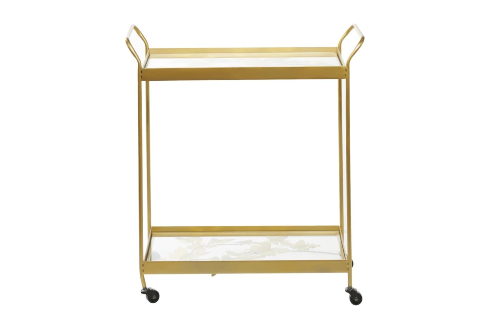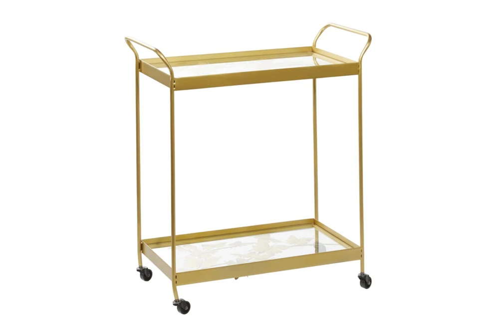 The Gold Metal Bar Cart is a contemporary 2-tier serving cart with shelves and wheels, perfect for small spaces in the dining room. Its whimsical and enchanting golden butterfly design is intricately crafted from fine iron and glass materials, and features a stunning clear glass finish and polished gold body exterior.