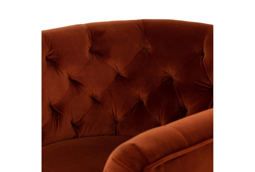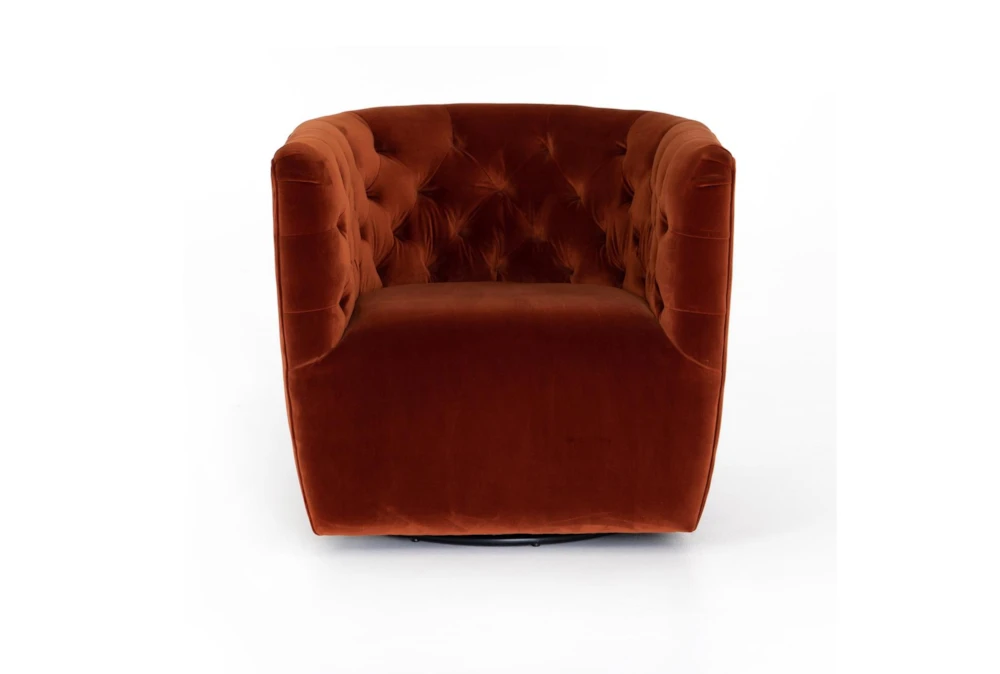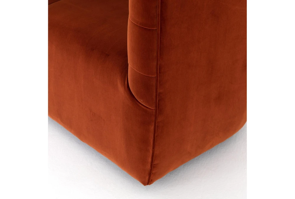 The Hanover Swivel Chair in Sapphire Rust is a modern, orange-colored chair made of fabric that features tufted, curved foam cushions, a tight back, and arms, perfect for small living spaces. Its swivel function allows for easy movement and its sapphire rust color adds a pop of color to any room.