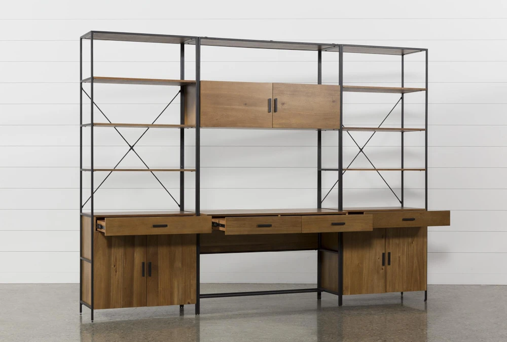 To do the best work, you need to create the best work space, and our Hollis 3-piece desk with cabinet piers will help your vision come to fruition. Thanks to the modular nature of this set, you can arrange the desk and cabinet piers separately or together. Minimal and streamlined, these items are crafted with sturdy engineered wood, stylish acacia veneers and sleek steel frames in a powder-coated matte black finish. Special highlights include open and closed storage for office accoutrement, media cutouts to control cord clutter and drawers that keep essentials accessible.