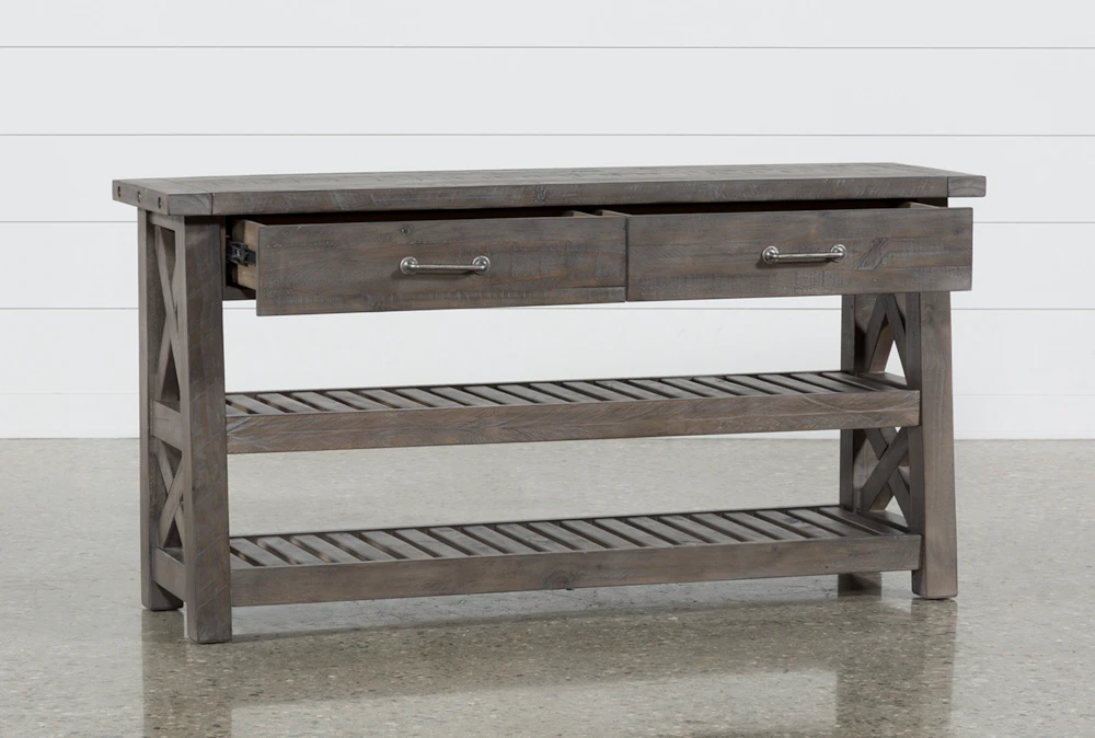 Our Jaxon Grey sofa table updates one of our most popular rustic styles with a new finish and new features. Distinguished by all natural solid pine construction, it brings fresh color, unique texture and convenient functionality to your living room. The design includes 2 drawers for storing accessories and 2 slat shelves for displaying magazines, books and accents.