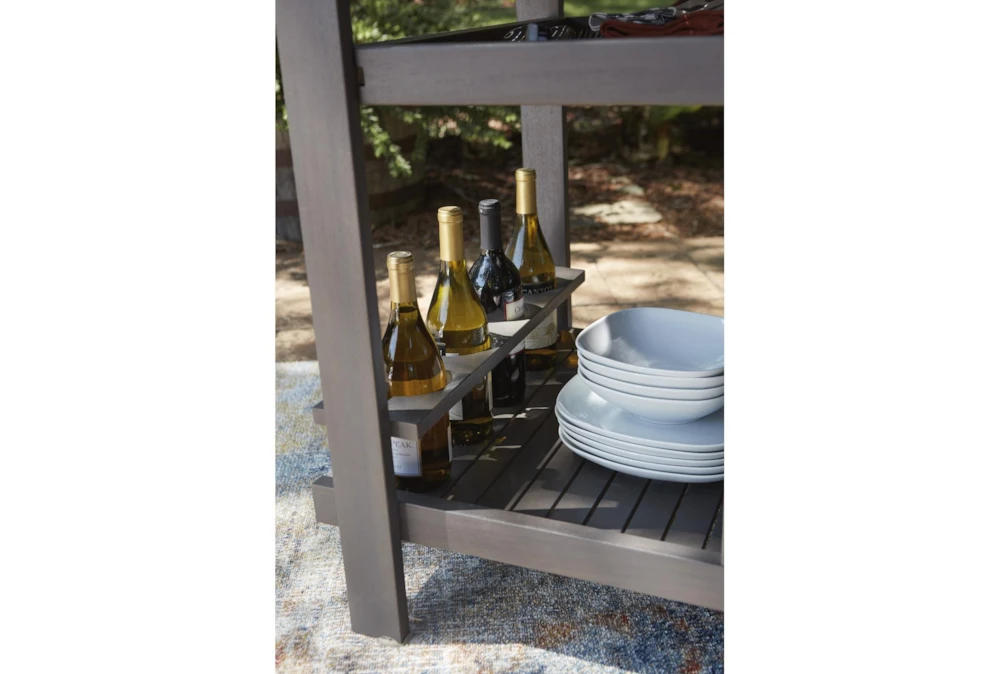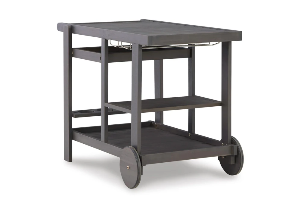 Made of acacia wood. Durable gray colored polyurethane finish. Stainless steel hardware. Slatted shelves. Removeable serving tray. Bottle and wine glass holder. Wheels on front for mobility.