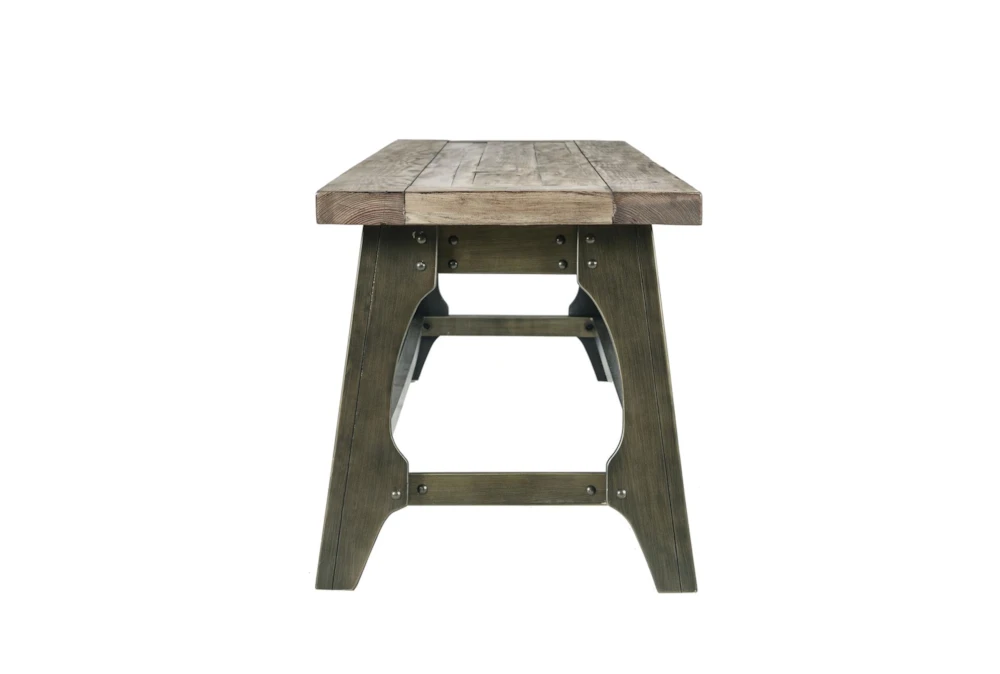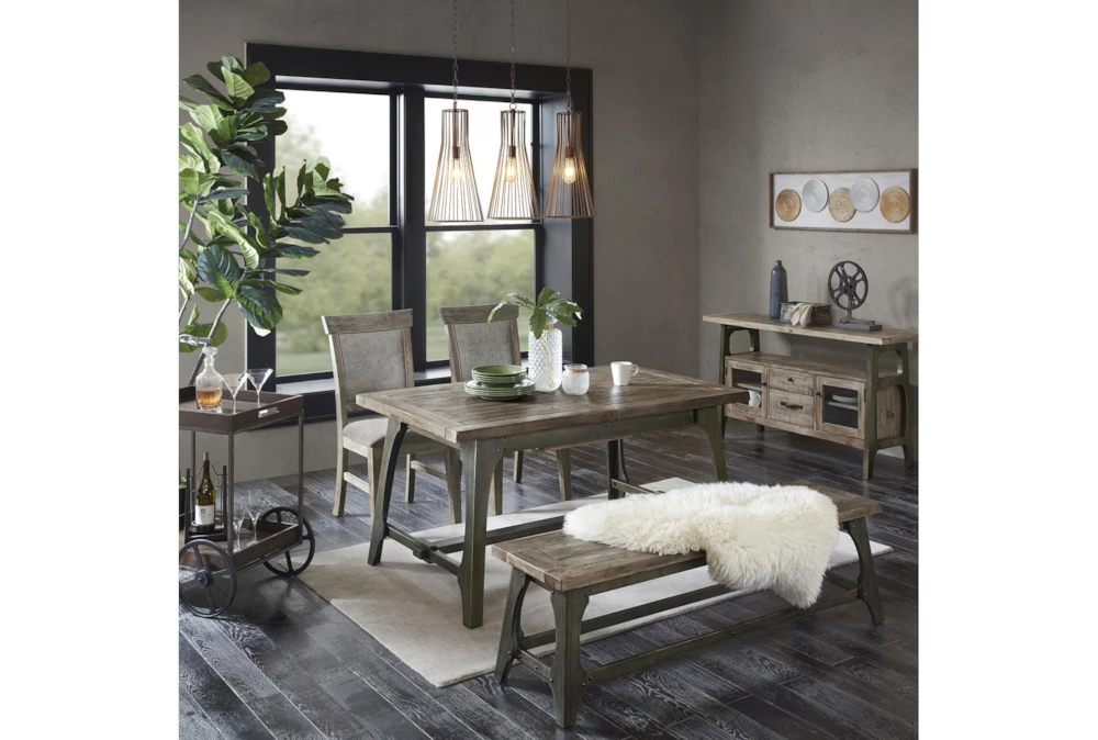 The Kayden 59″ Bench is an industrial-style backless bench made of weathered grey industrial pine panels and a metal decorative bracket with antique bronze finish. Assembly is required for this dining room piece, which also features rubber wood legs.