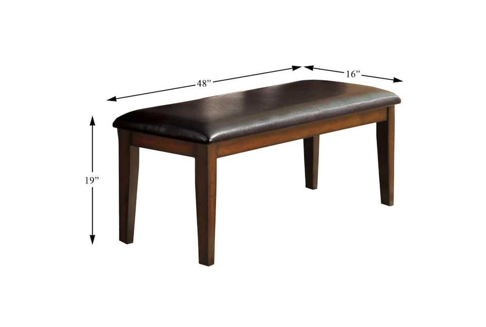 The Kian 48 Inch Faux Leather Bench is a rustic-style backless bench made of solid wood and faux leather in a brown color, with cherry accents and a cushion that requires assembly.