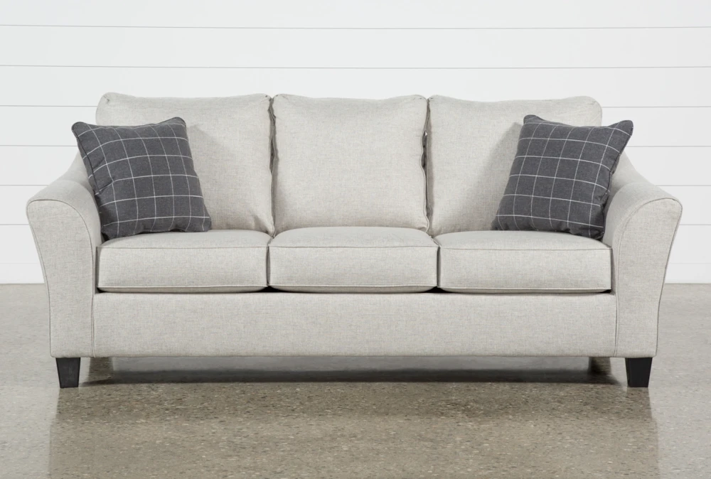 Kinsley is where fresh design meets timeless elements, for less. The 92” sleeper sofa exudes modern sophistication balanced with clean lines . Modern knole-style arms add a nod to traditional design, while pewter grey upholstery is a perfect modern-day neutral. Kinsley includes two taupe and grey plaid pillows and a queen-size memory foam mattress that overnight guests will love.