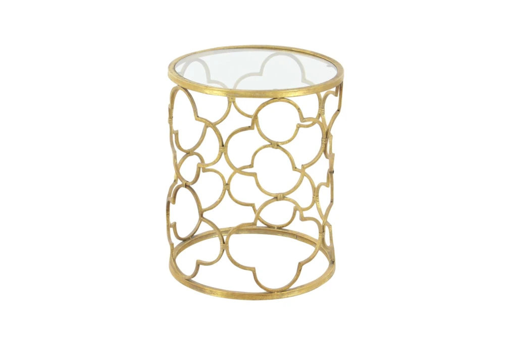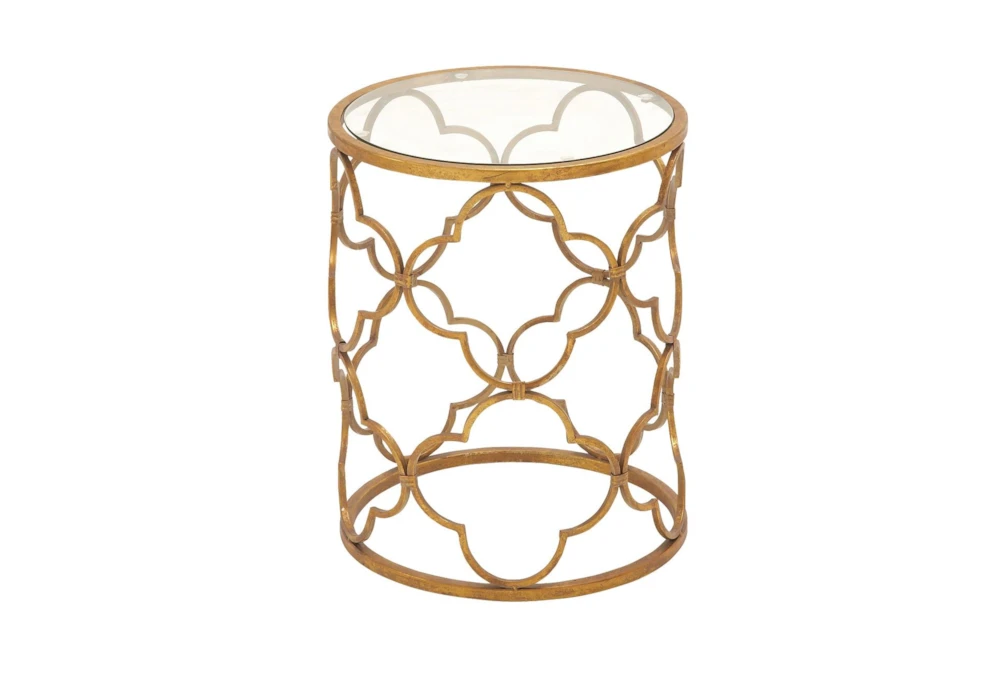 The Lalita Metal & Glass Accent Table is a stylish addition to any space, featuring a contemporary industrial design made of metal with a gold finish and a glass surface. The cylindrical iron base has a lattice design, and the table comes fully assembled.