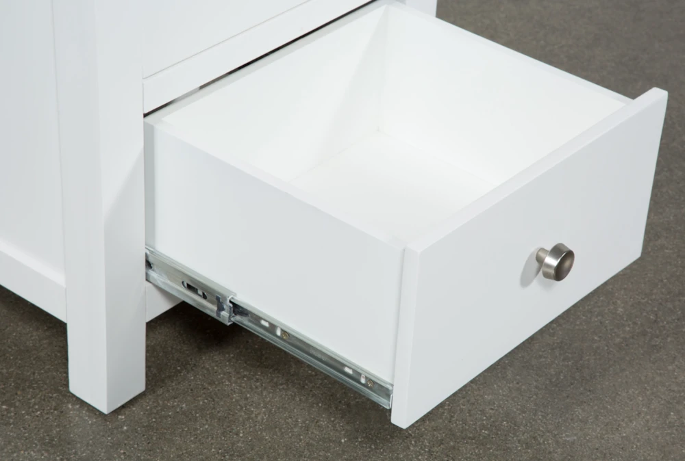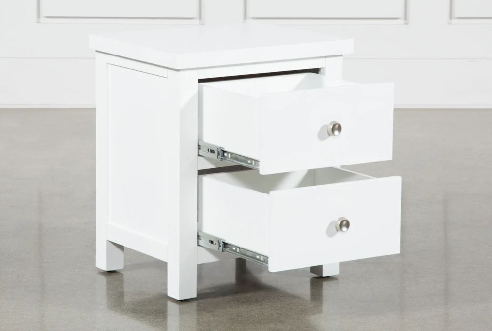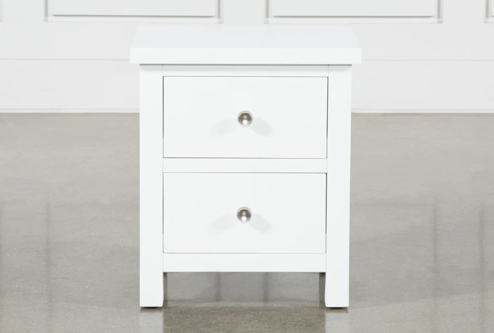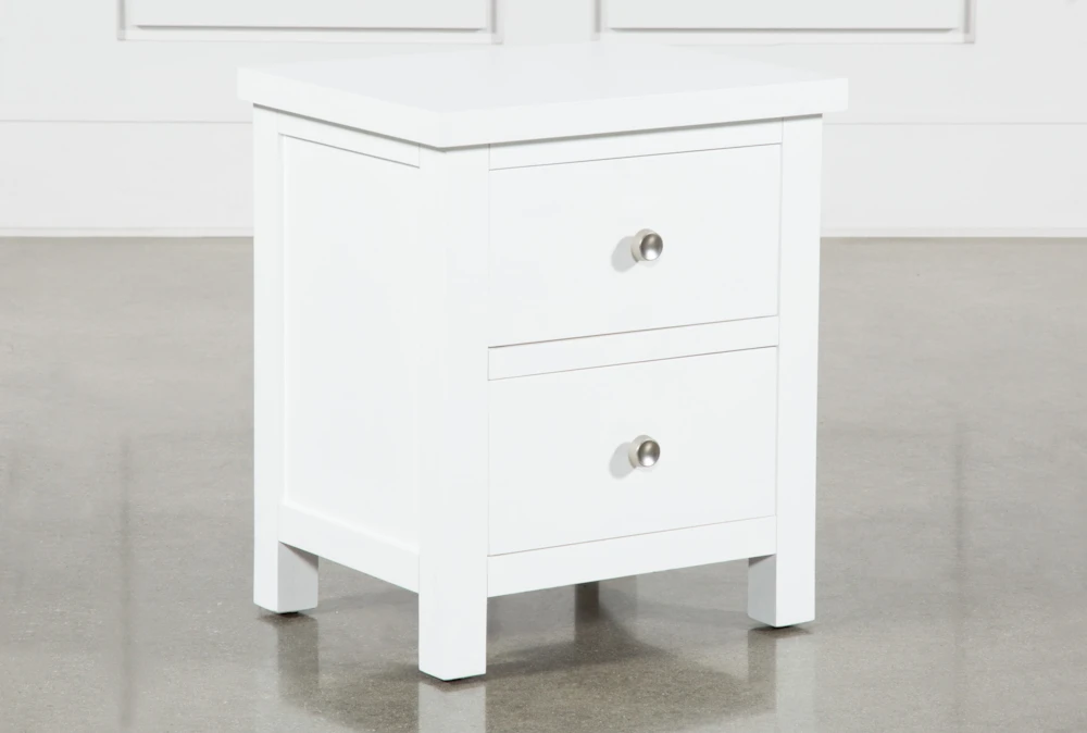 Our Larkin nightstand brings simplicity, versatility and ease to your space for less with its streamlined design. This breezy white piece boasts solid wood and MDF – for added strength and consistency – plus a multi-step smooth painted finish and custom pewter handles. The full-depth drawers with ball-bearing glides ensure reliable, roomy storage for clothes and essentials.