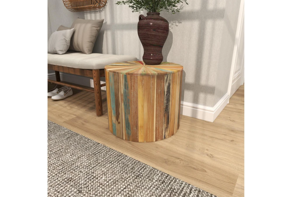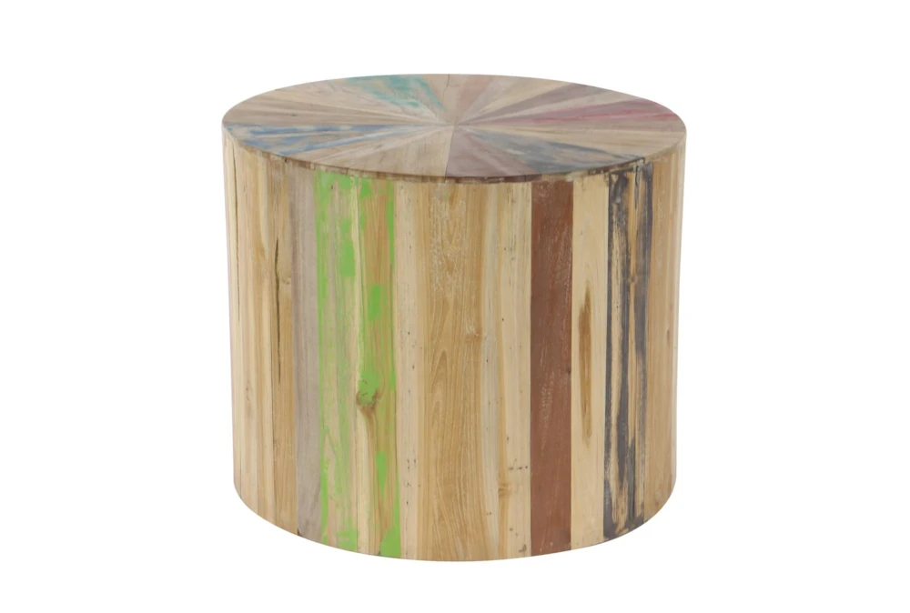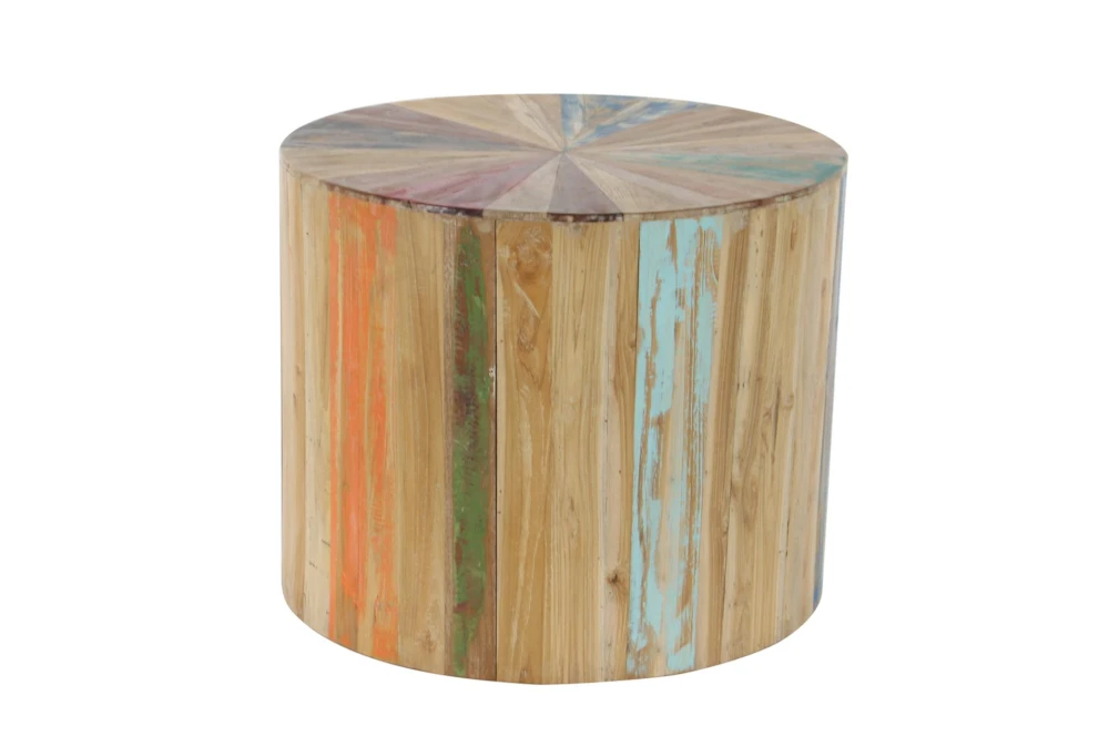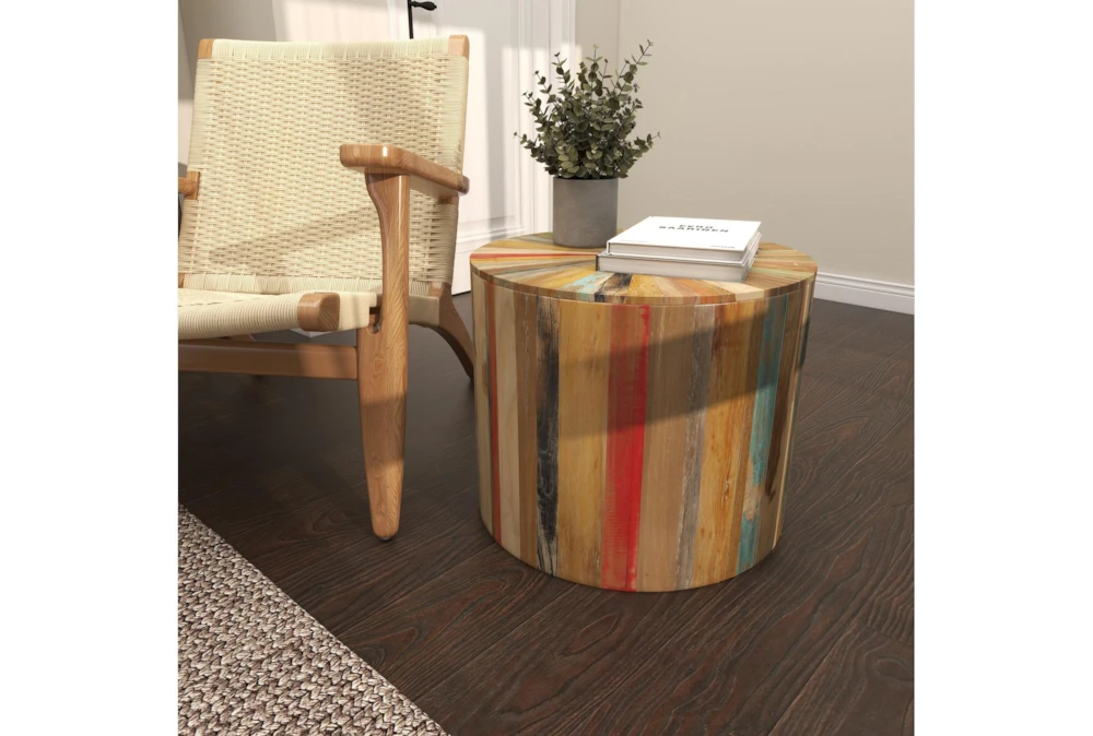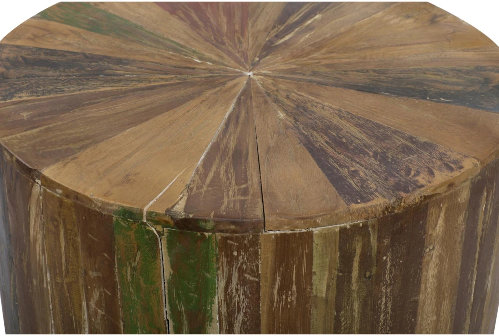 This rustic, light brown accent table is made entirely of reclaimed wood, giving it a unique and eco-friendly charm. Assembled for your convenience, this drum-shaped table is the perfect addition to any living space.