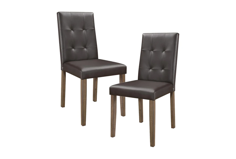 These two dining side chairs feature a tufted design and come as a set of two, perfect for a casual dining room setting. Made of wood and faux leather with a walnut finish, these chairs require assembly and are constructed with Asian hardwood, engineered wood, and foam.