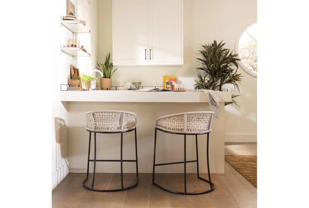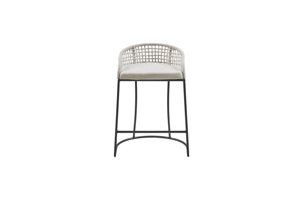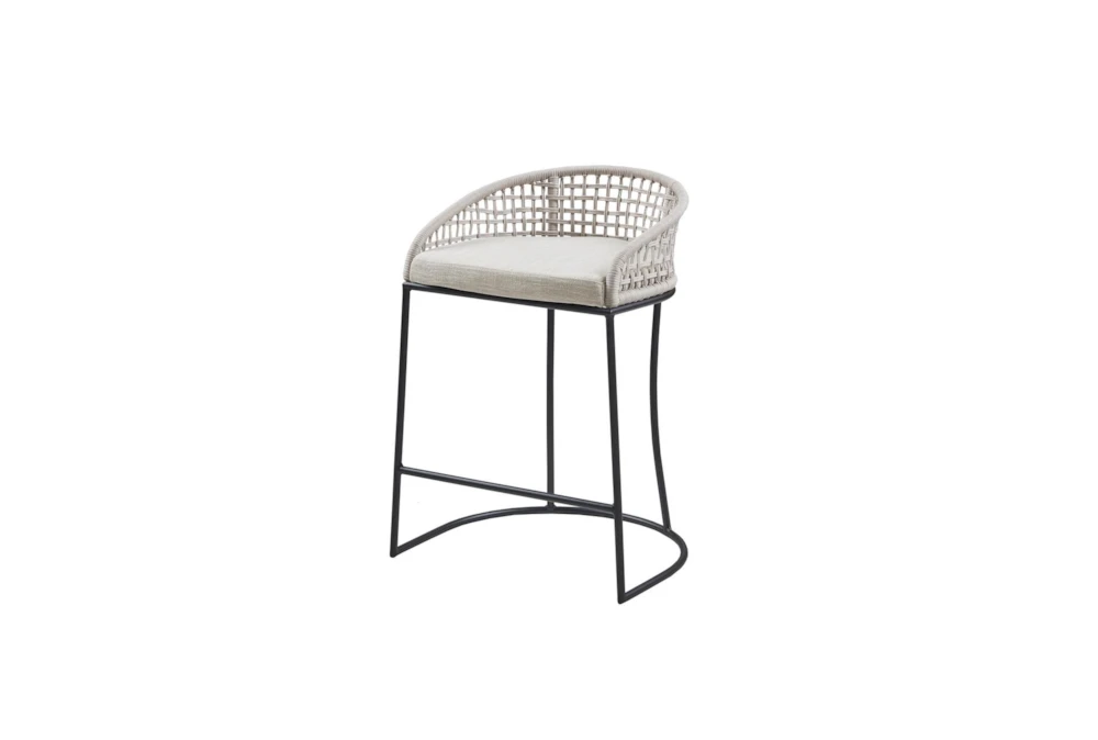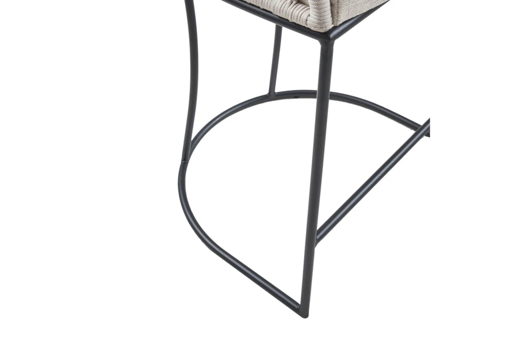 The Low Back Woven Counter Stool is a modern style wooden stool with a tall height. Assembly is required and the frame composition is made of metal and plywood, with metal legs and arm material in the form of a tube base and nylon rope woven design. The fabric composition is 80% polyester and 20% linen, with foam cushion or upholstery fill material, and an iron finish on the metal.