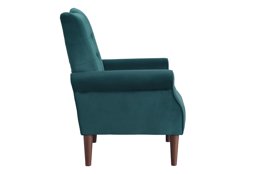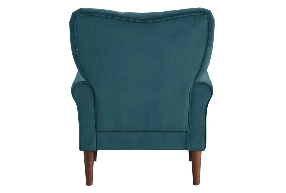 Magdala Teal Accent Chair is a contemporary indoor club chair, upholstered in blue velvet with tufted tight back, rolled arms, and foam cushions. This chair requires assembly and is made of wood, engineered wood, foam, and fabric.
