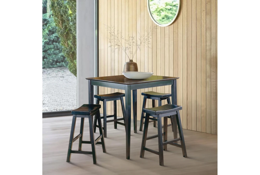 The Marcel Black Counter Set is a rustic-style dining room set made of solid black wood, featuring a tall 5-piece design that requires assembly.