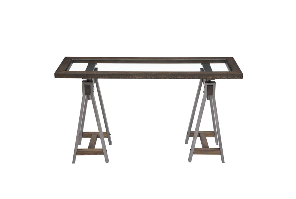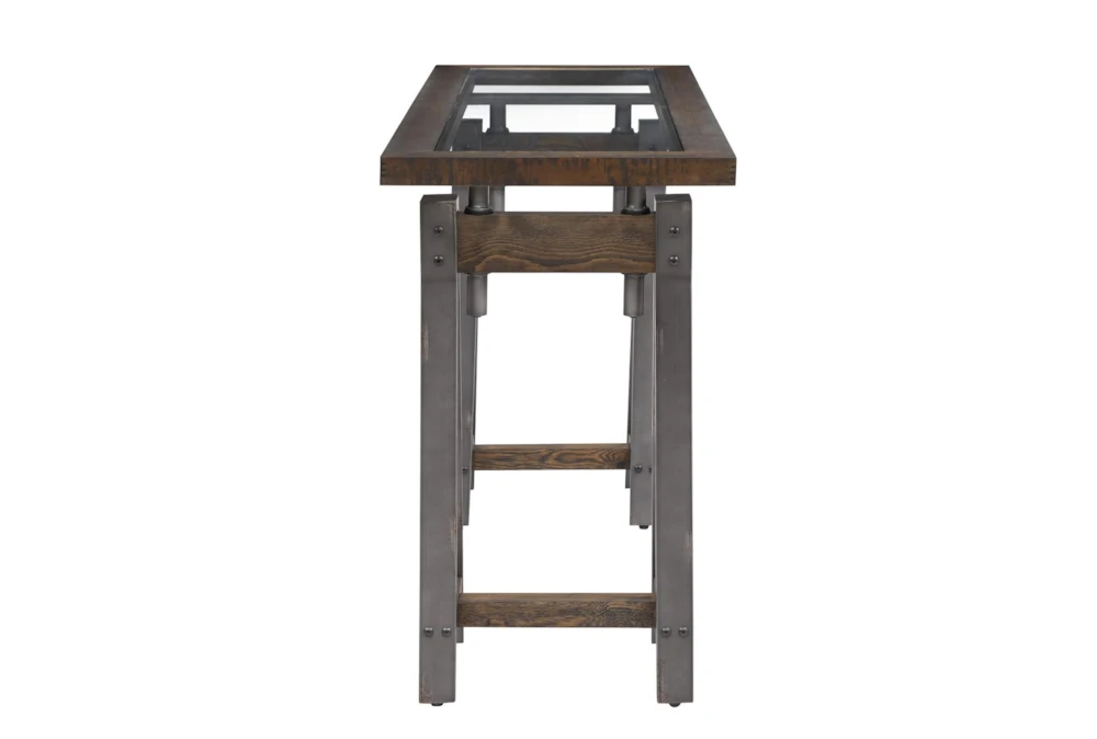 The Medici 54″ Console Table is an industrial-style piece made of solid wood and metal, featuring a glass top for added sophistication and style.