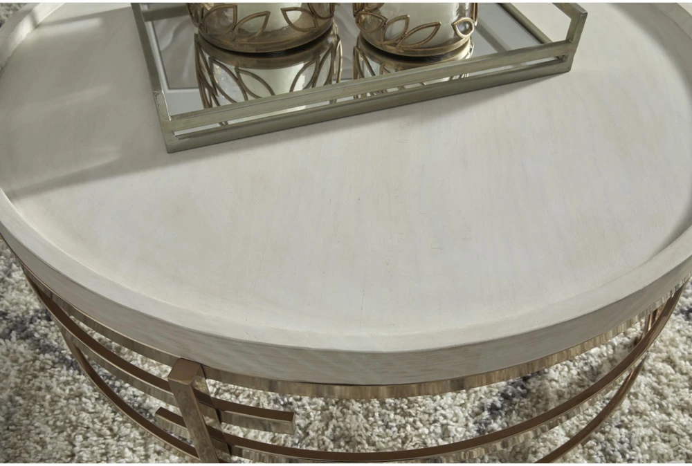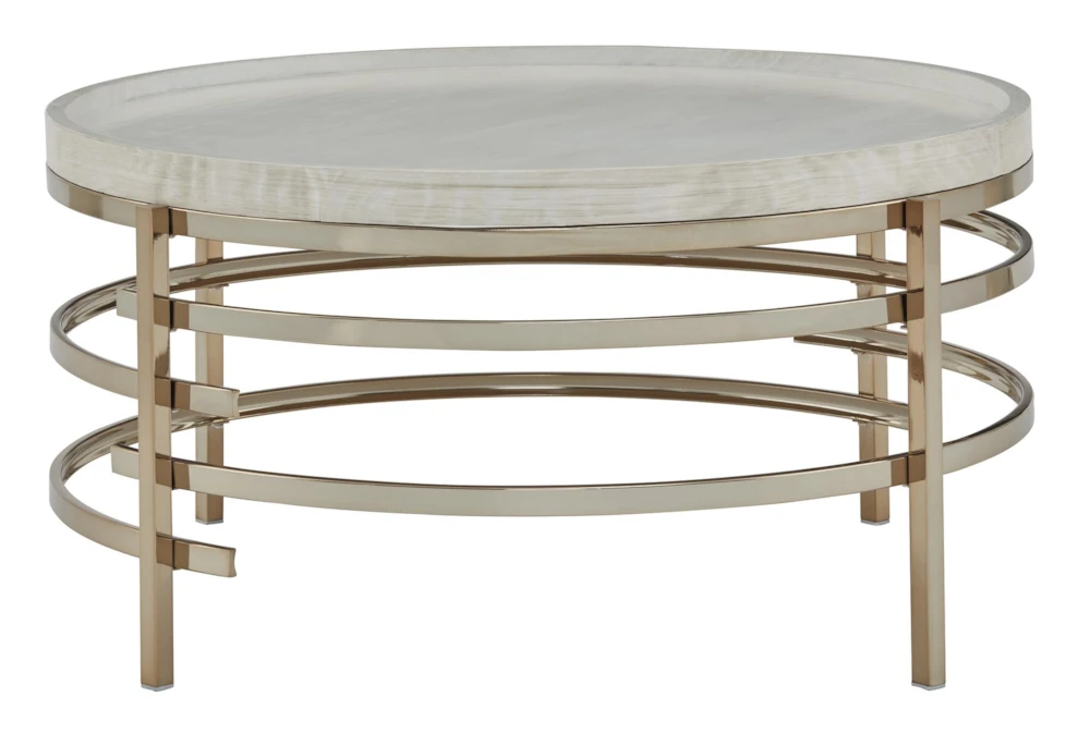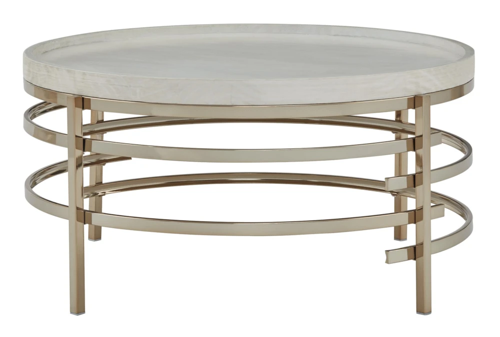 The Monti Coffee Table boasts a modern design, made of wood and accented with metal. Assembly is required and the table is available in a white/gold color scheme.