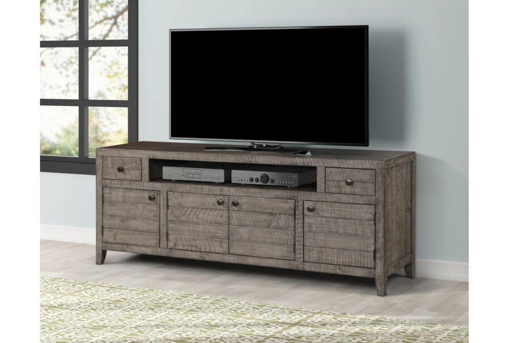 Peoria Greystone 76″ Tv Stand is a rustic-style wooden stand designed for the living room, with a grey color, adjustable shelves, and drawers for storage, a soundbar shelf, and storage doors, all featuring dovetail construction, solid pine planks, pine solids, and birch veneers. Other properties include a multi-step long lasting finish, wood doors with adjustable shelves behind for concealed storage, and a soundbar opening designed to accommodate the latest technology.