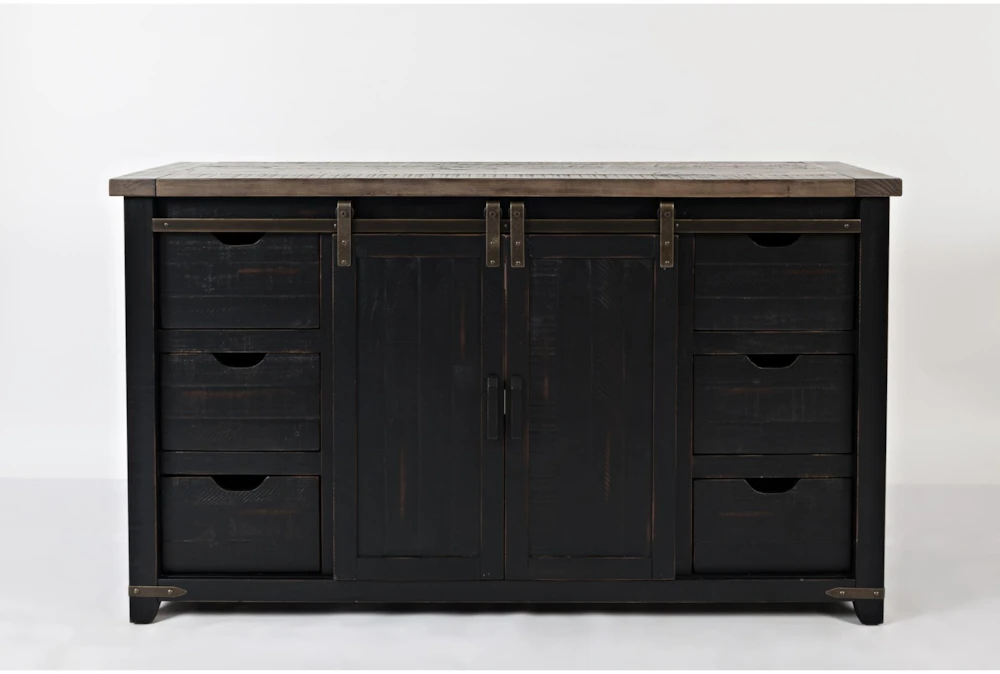 The Pepper Creek Vintage Black 60 Inch Sideboard is a rustic style piece made of wood and metal, with 6 drawers, shelves including adjustable shelves, and barn style doors, perfect for a dining room. Additional properties include the color black, made of pine, and 2 shelves in the middle.