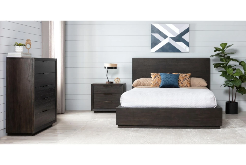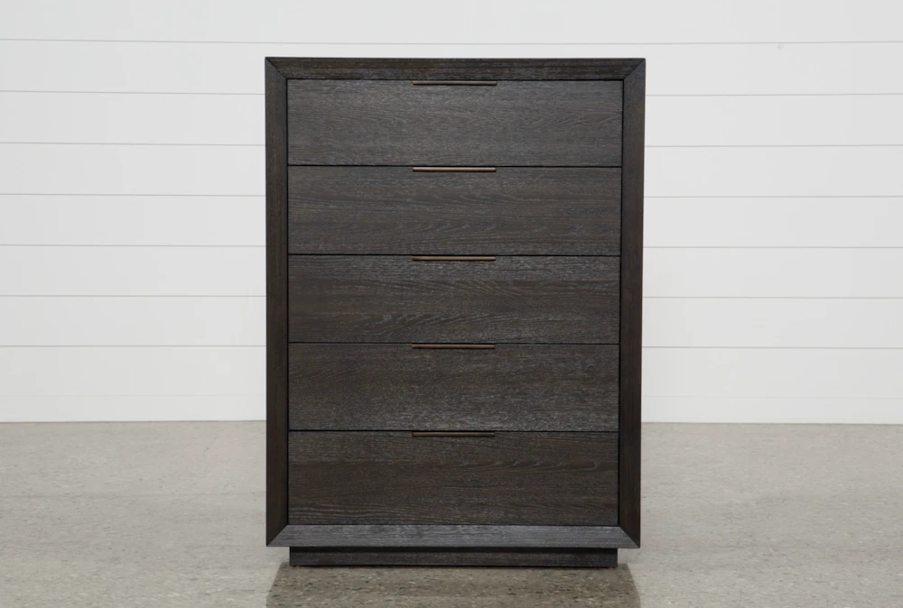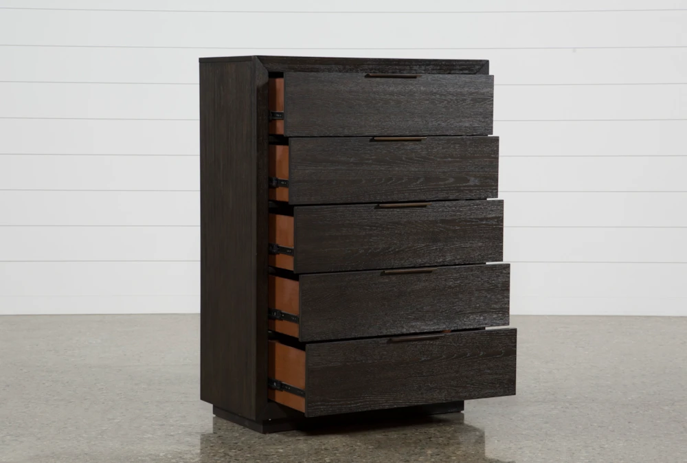 Bring bold minimalism and high function to your personal retreat with our Pierce chest of drawers. From clean, strong lines, to a rich, contemporary color, this 5-drawer design has it all at an unbelievable value. Hardwood and oak veneer instill strength and character, which comes through distinctly in the wood grain. The streamlined, boxy profile is also balanced by thin metal handles and a dark rubbed finish that combines black, grey and brown tones.