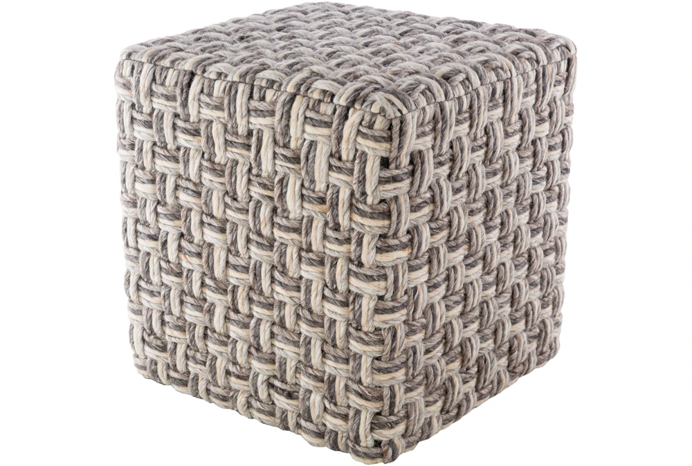 This Pouf-Basket Weave Charcoal And Cream is a rustic style fiber piece made of wool, polyester, and polystyrene block. The color options include charcoal, camel, light gray, and cream, with a natural color base.