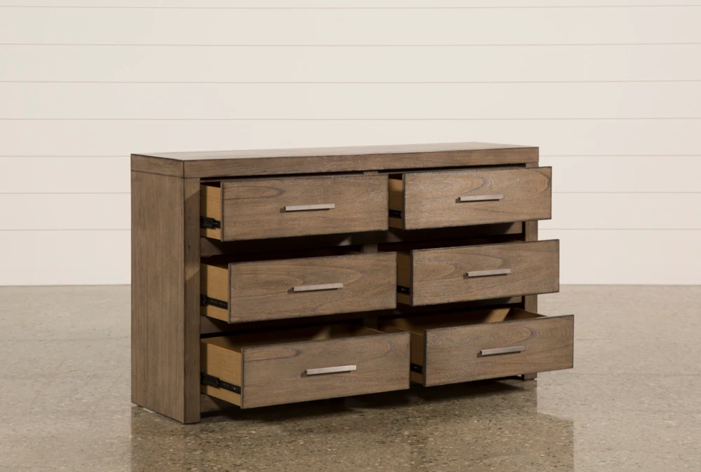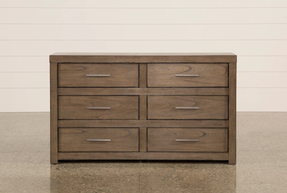 Our Riley dresser will add plenty of character and order to your bedroom. Crafted of hardwood and veneer, the handsome, streamlined piece features a greystone finish and zinc hardware.