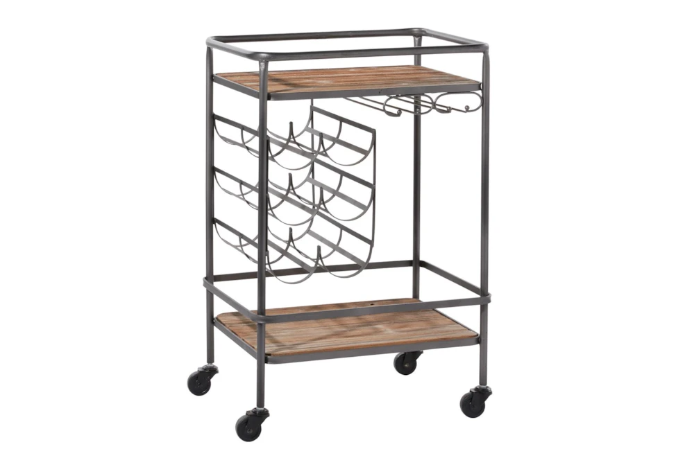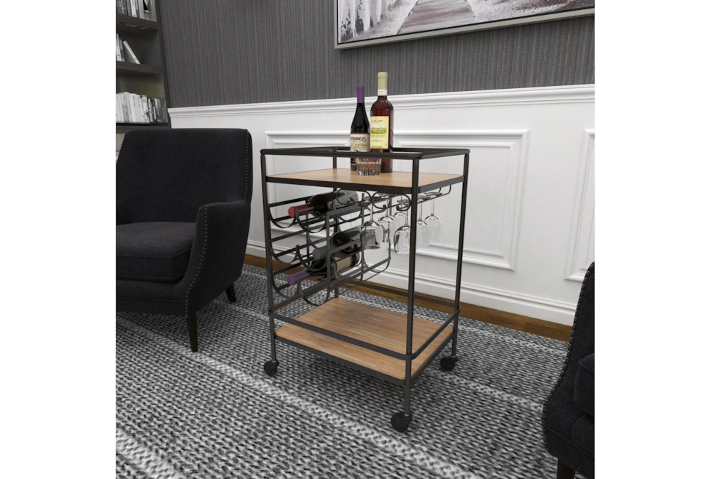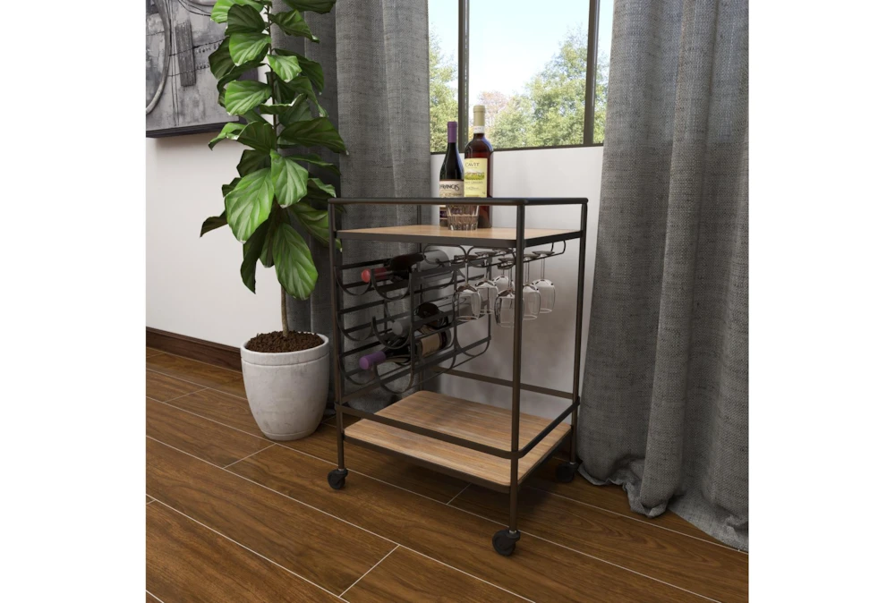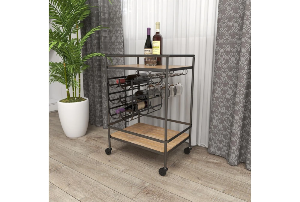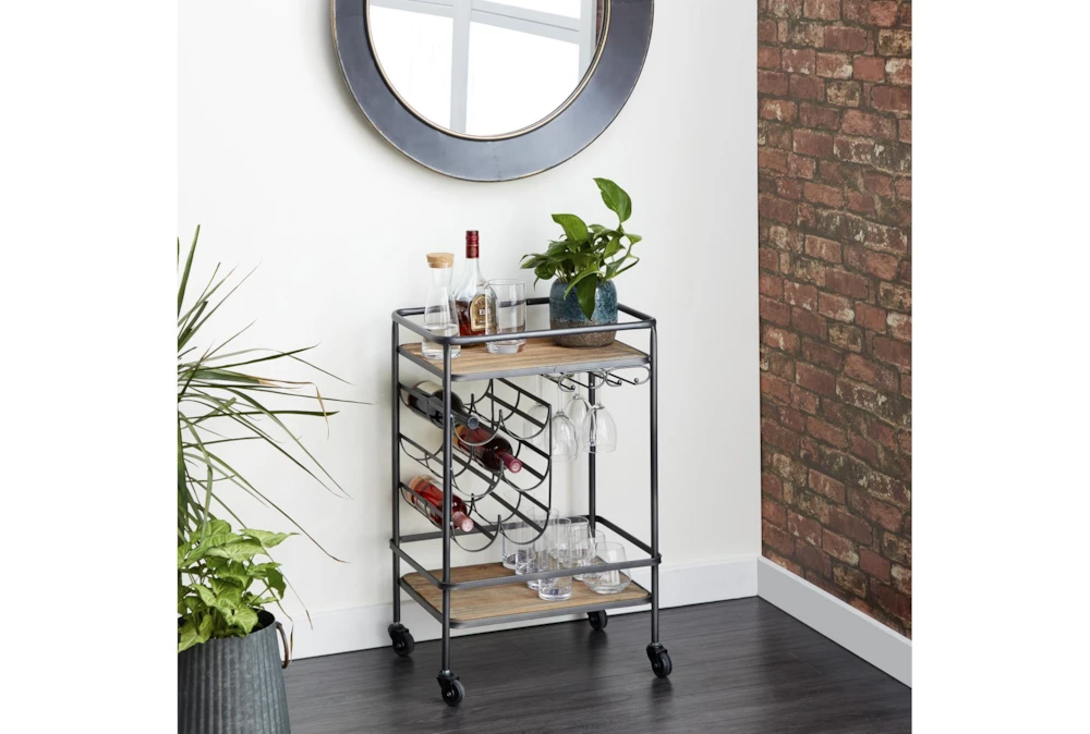 The Rolling Industrial Bar Cart is an assembled, narrow, 2-tier cart with a wine rack and wine glass rack, perfect for small spaces. Crafted with fir wood and iron, this industrial-inspired cart features a natural wood brown finish with a black obsidian frame, storage door, and smooth caster wheels for easy mobility.