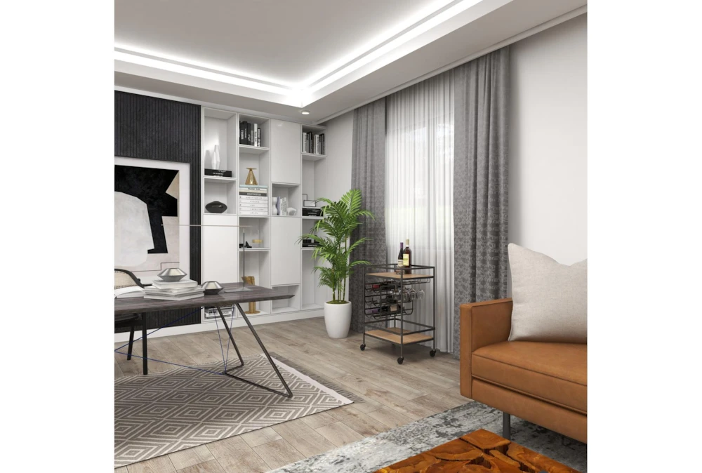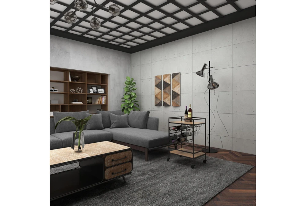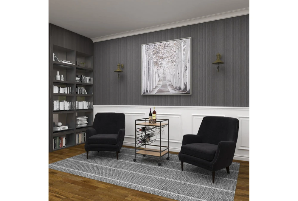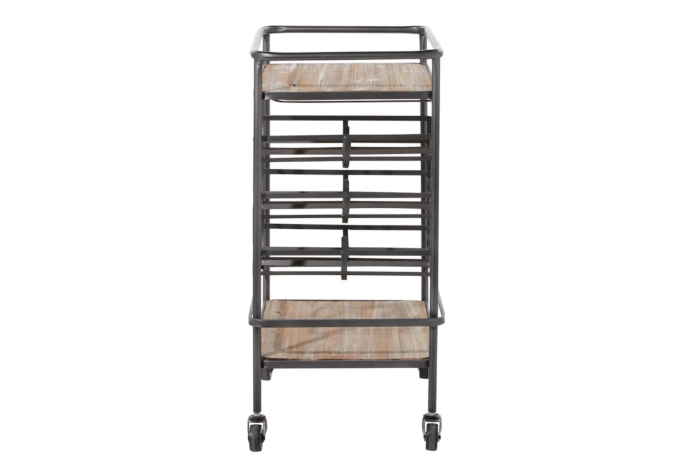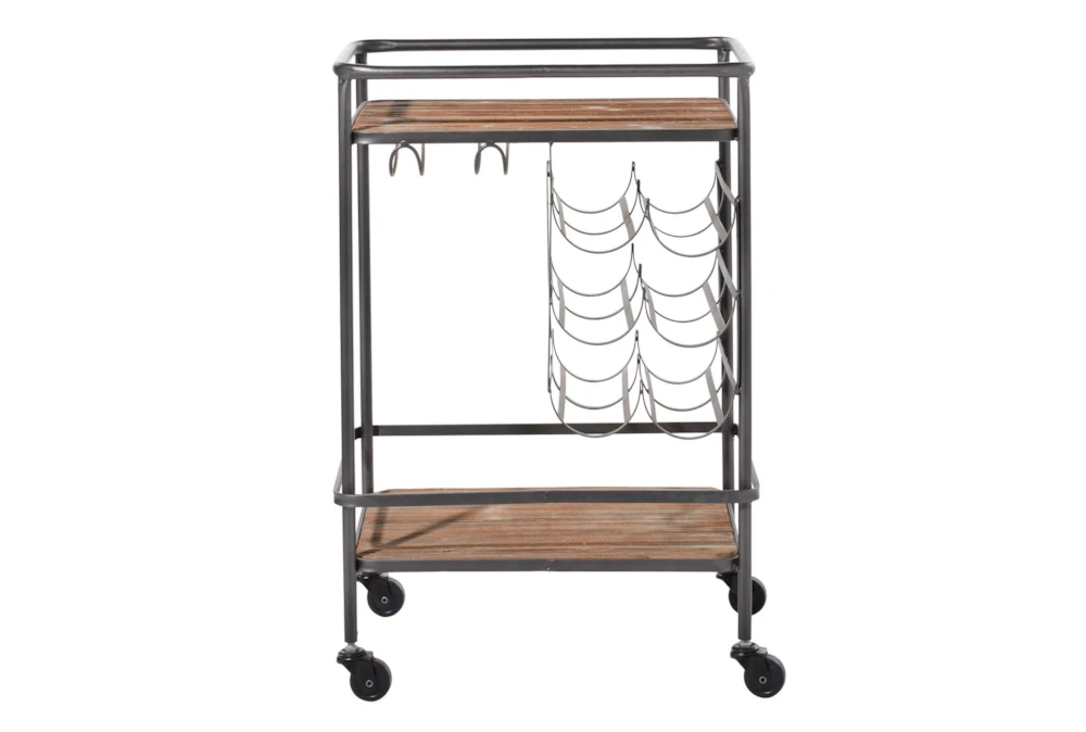 The Rolling Industrial Bar Cart is an assembled, narrow, 2-tier cart with a wine rack and wine glass rack, perfect for small spaces. Crafted with fir wood and iron, this industrial-inspired cart features a natural wood brown finish with a black obsidian frame, storage door, and smooth caster wheels for easy mobility.