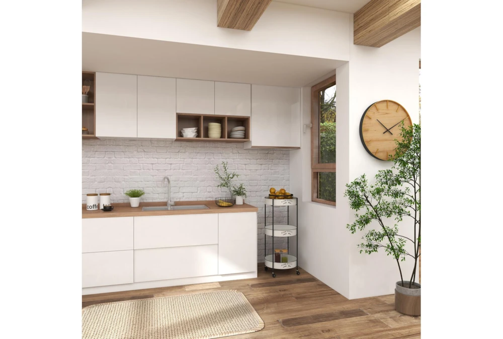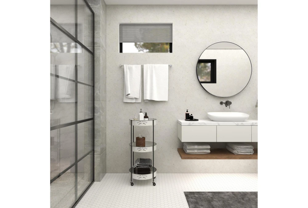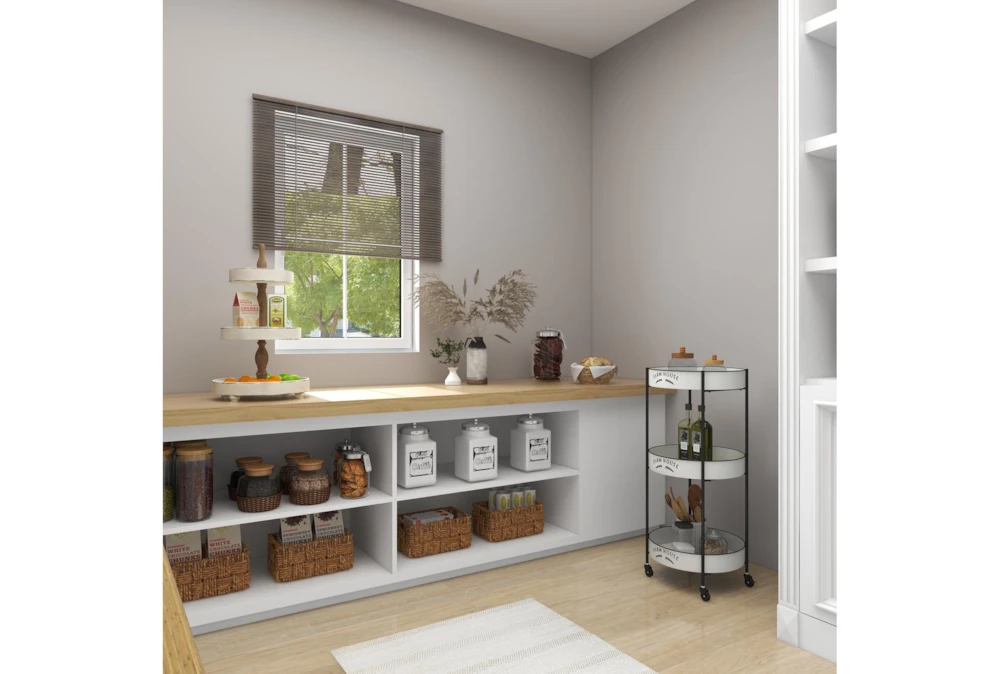 The Round White Iron 3 Tier Farmhouse Rolling Storage Cart is a stylish and functional addition to any dining room, with its tall, narrow design and convenient rolling casters. This farmhouse cart is made of durable metal and features 3-tier storage shelves with embossed details over a powder white finish, perfect for small spaces in need of extra storage.
