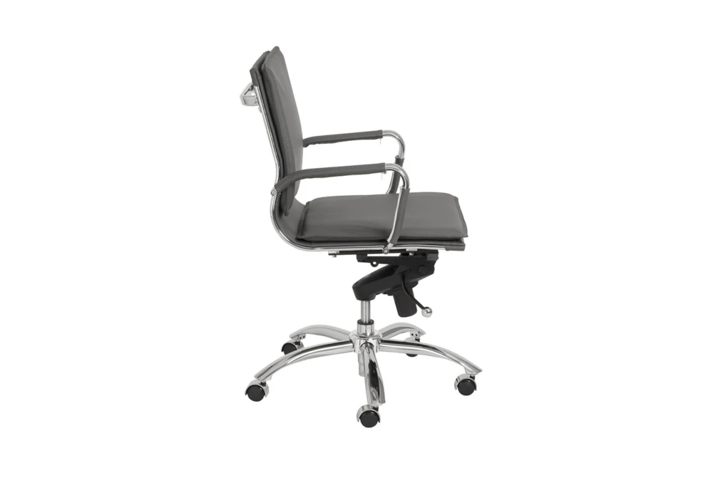 This Skagen Grey Faux Leather and Chrome Low Back Desk Chair is the perfect addition to any contemporary office, featuring casters, wheels, arms, gas lift, swivel, ergonomic design, and rolling capabilities. The sleek and stylish design, combined with the comfortable leather material, makes it the ideal choice for any office setting.