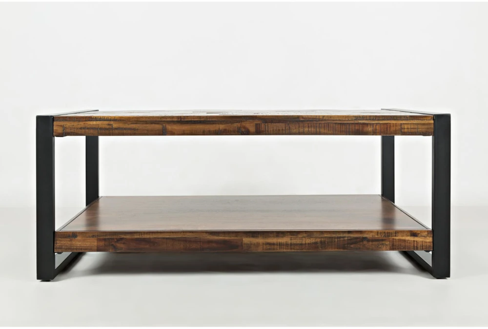 The Tarin Coffee Table is a casual style piece made from solid acacia wood and metal, with the added feature of storage shelves.