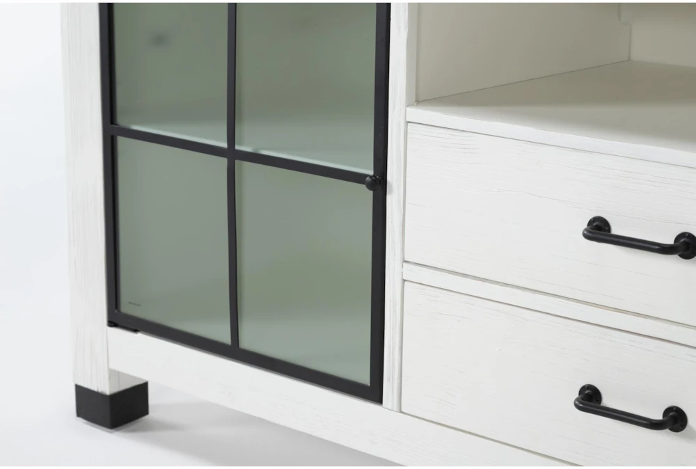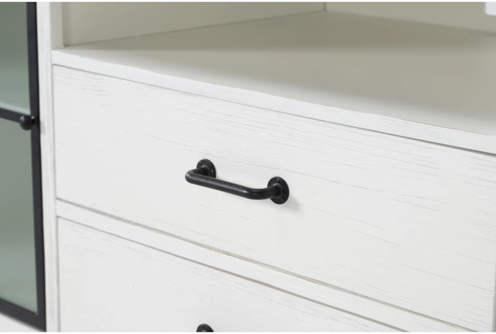 When it comes to bringing charm, character and function to your space, no design does it better than our Wade entertainment center. Enriched by farmhouse features, it offers inviting style, quality construction and a combination of hardworking materials. In addition to solid pine and pine veneers in a silo white finish, you’ll find metal elements in a forged iron finish. Drawers with French and English dovetail joinery and side-mounted ball-bearing guides ensure smooth operation.