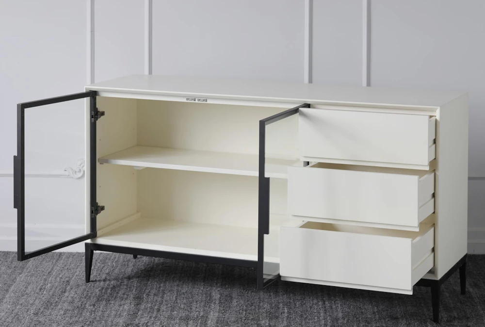 This modern White 3 Drawer 2 Door Sideboard is crafted from wood and features glass and metal accents. It offers ample storage, with 3 drawers, shelves, and both solid and glass doors, making it the perfect addition to any contemporary interior.