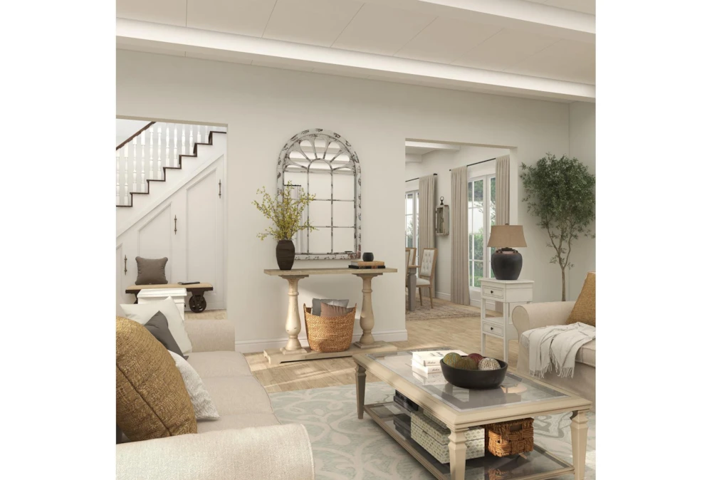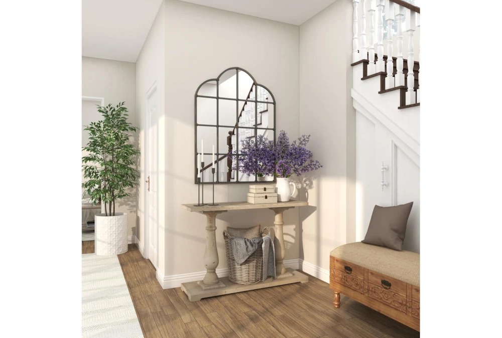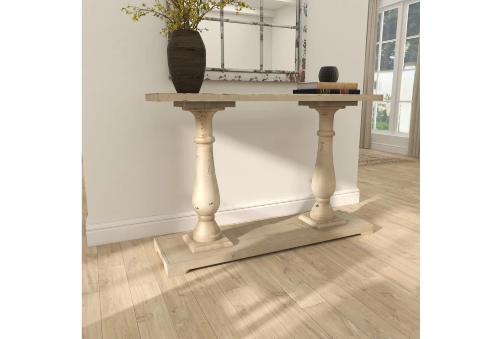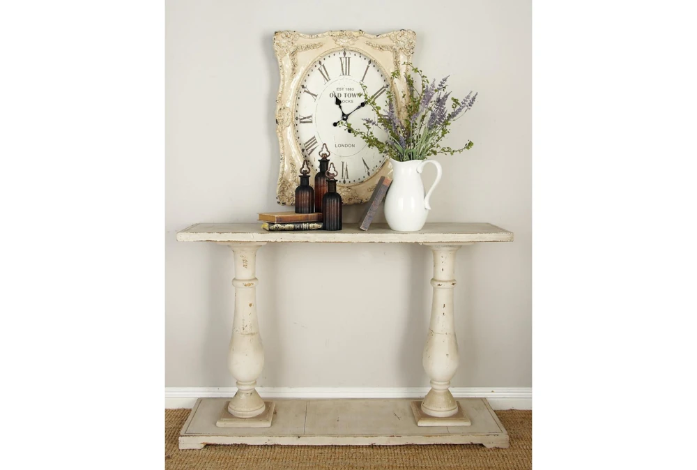 Two-Sentence Description: Add classic style and cozy appeal to your living room with our White 48″ Console Table featuring a curved, pedestal design and made from Chinese fir wood materials.