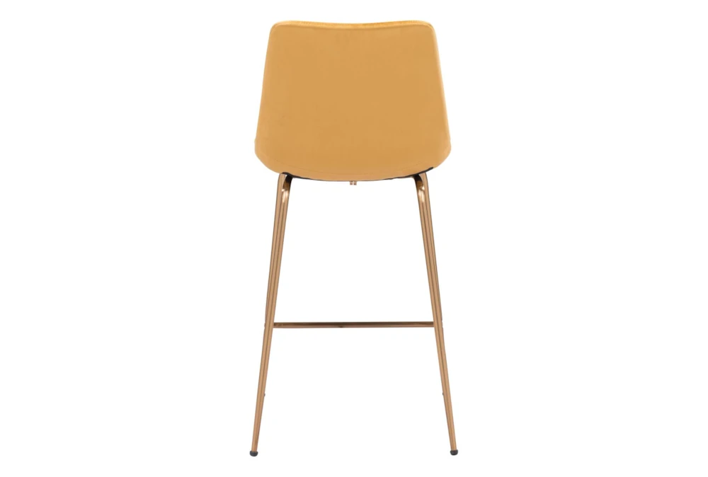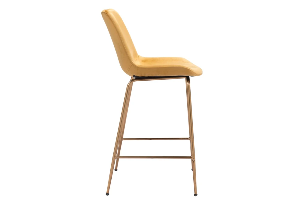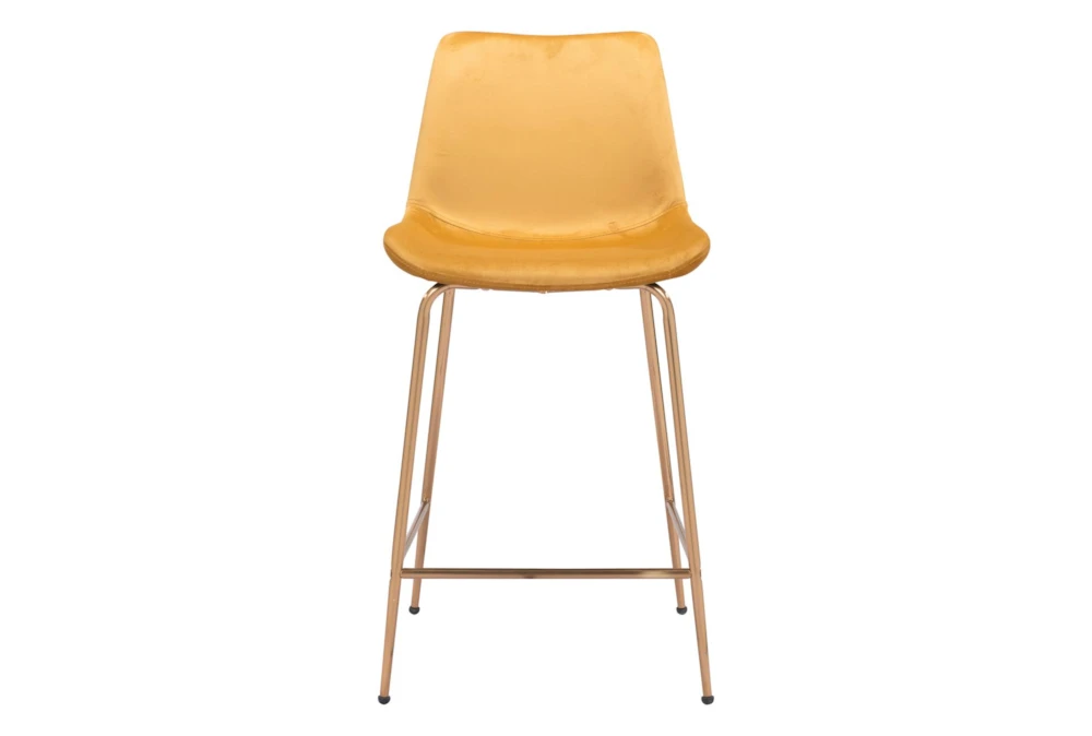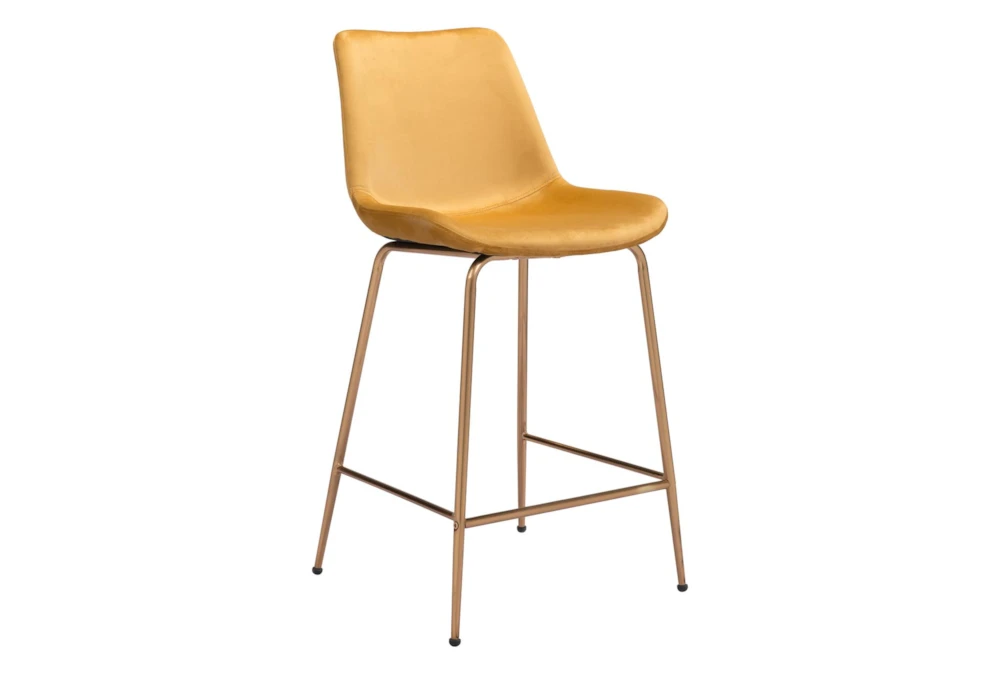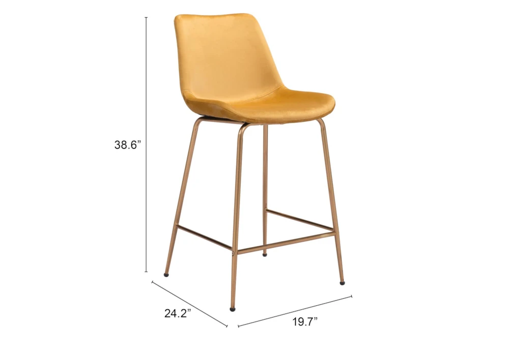 The Yellow Velvet Bucket Counter Stool is a modern piece of furniture for your dining room, made with metal and 100% polyester fabric. It is tall, armless, and features a comfortable backrest. Assembly is required.